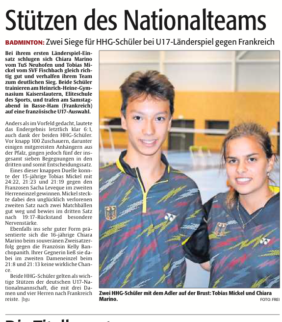 Badminton: Stütze des Nationalteams 04.09.2018 Mit freundlicher Genehmigung der Rheinpfalz (4.09.2018)