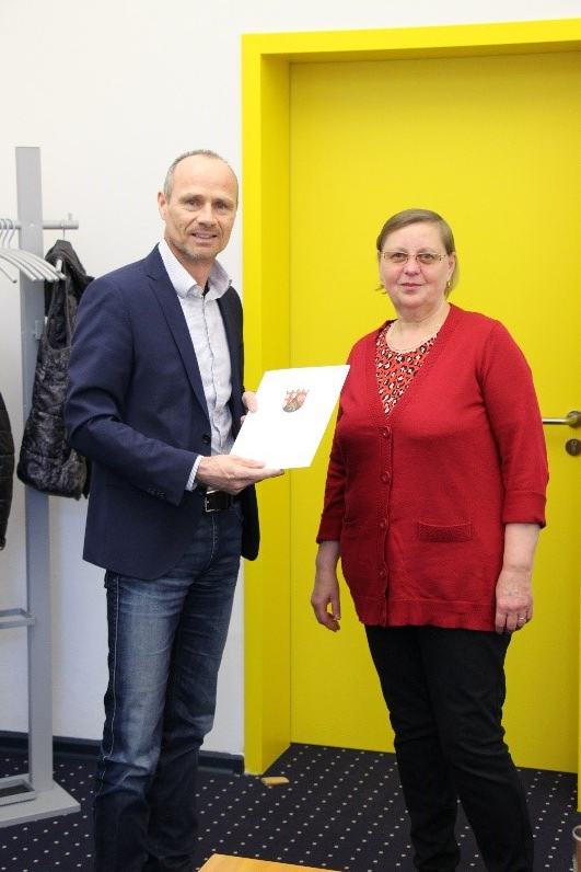 Herr Emmermann überreicht Frau Kirchner die Urkunde des Präsidenten der ADD