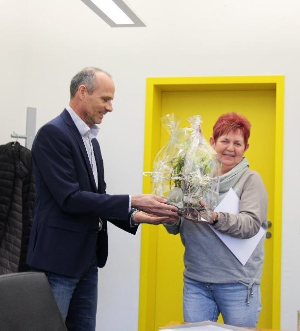 Studiendirektor Lars Emmermann dankte den beiden Kolleginnen für ihre langjährige treue Pflichterfüllung und überreichte neben der Urkunde des Präsidenten der ADD ein schönes Blumengebinde.