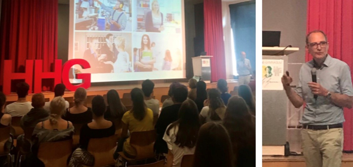 Bei der Veranstaltung am Dienstag in unserer Aula informierte Prof. Herrmann zunächst allgemein über die Optionen Universitätsstudium, Hochschulstudium und Ausbildung, bevor er detaillierter über Inhalt eines Biologiestudiums sprach und zugehörige Berufsbilder schilderte. Die Kompetenzbildung im naturwissenschaftlichen Studium wurde unseren Schülerinnen und Schülern danach ebenso erläutert wie die verschiedenen möglichen Studiengänge an der TU Kaiserslautern. Bei Prof. Herrmanns kurzer Erklärung der Einteilung des Bachelor-Studienganges in Vorlesungen, Grundpraktika, Seminare und Fortgeschrittenen-Praktika erwähnte er, dass es bei den großen Biologie-Vorlesungen mit 350 Teilnehmern nicht selten vorkomme, dass die beste Klausur von Schülerinnen und Schülern des Hochbegabtenzweigs geschrieben werde, die ein Schnupperstudium in der MSS absolvieren. Nach weiteren Informationen zum Studium an der TU Kaiserlautern, die in Deutschland-Rankings immer sehr gut abschneidet, stellte Prof. Herrmann einige Forschungszweige vor, in denen Biologiestudiumsabsolventen arbeiten, bevor die anwesenden Schülerinnen und Schüler Fragen stellen durften, die Prof. Herrmann gern beantwortete. (Bx)