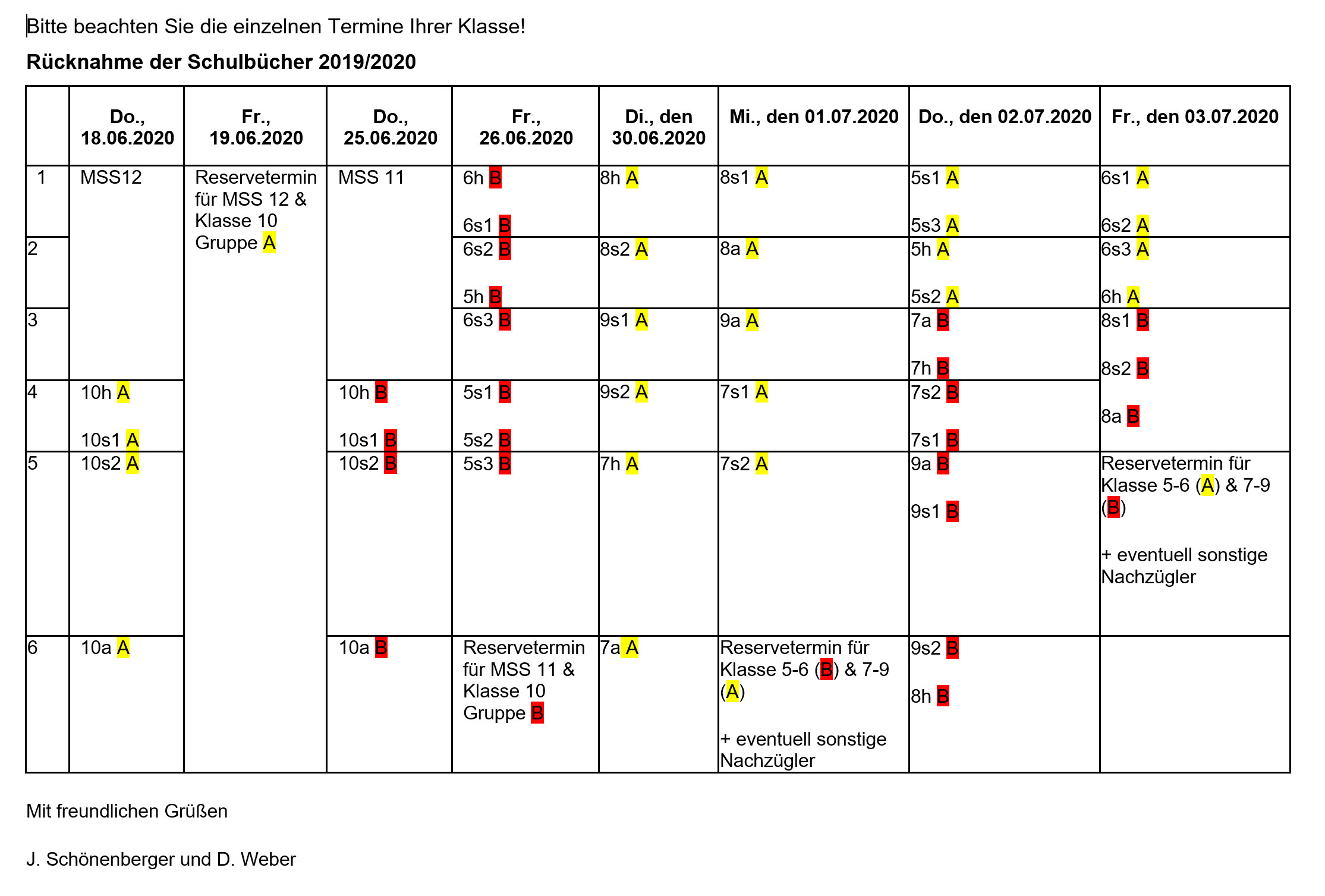 Termine für die Rückgabe der Schulbücher