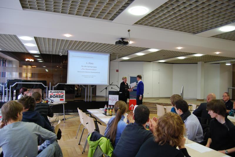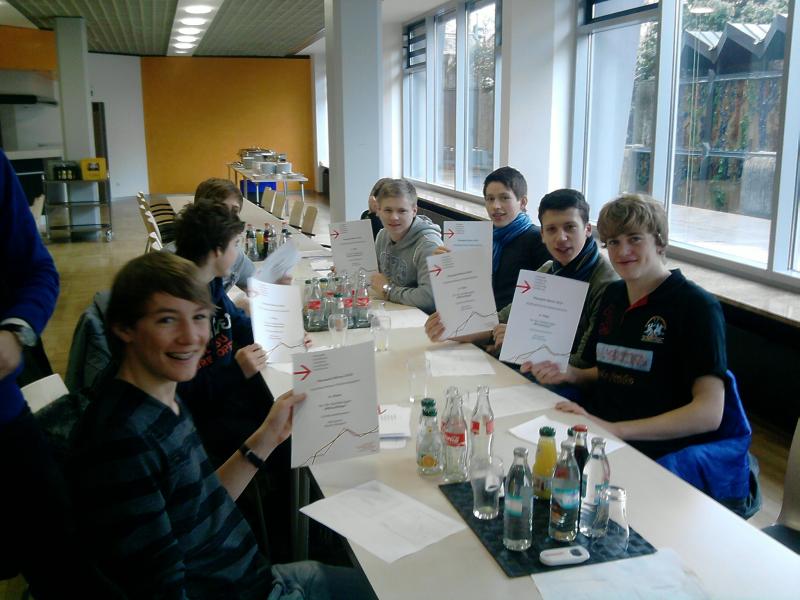 The Shareholders, unter der Federführung von Tristan Neumann, konnten sich durch geschickte Transaktionen den ersten Platz am „Lauterer Börsenhimmel“ sichern. Die Strategie der Shareholders steigerte den fiktiven Depotwert von 50.000 € zu Beginn auf 61.179,18 € zum Spielende. Außerdem räumten sie neben dem Siegerpreisgeld für dieses Geschick auch noch den ersten Platz in der neu in die Bewertung aufgenommenen Nachhaltigkeitswertung ab. Diese Wertung kann man als eine Reaktion auf die Geschehnisse am Aktienmarkt in der jüngeren Vergangenheit interpretieren und dies zeigt, dass auch ethische Überlegungen bei Investitionen an der Börse eine Rolle spielen können. Einen beachtlichen fünften Platz belegten die doch recht gepflegten Schimmelprinzen mit ihrem „König“ Jean F. Zimmer. Nicht nur mit Investitionen in Gemüse erreichten die Wärschings von Max Schwing den sechsten Rang. Unsere Börsianer tauchten zwischen der Auftaktveranstaltung am 09. 09.2010 bis zur Preisverleihung am 09.02.2011 sehr erfolgreich in das Haifischbecken der Börse ein und zeigten dabei ein gutes Gespür für das Geschehen an den Märkten und die Entwicklung der Kurse. Ich freue mich über die Erfolge unserer Schüler und es besteht bei mir auch keinerlei Zweifel an der umsichtigen Investition der gewonnenen realen Preisgelder.