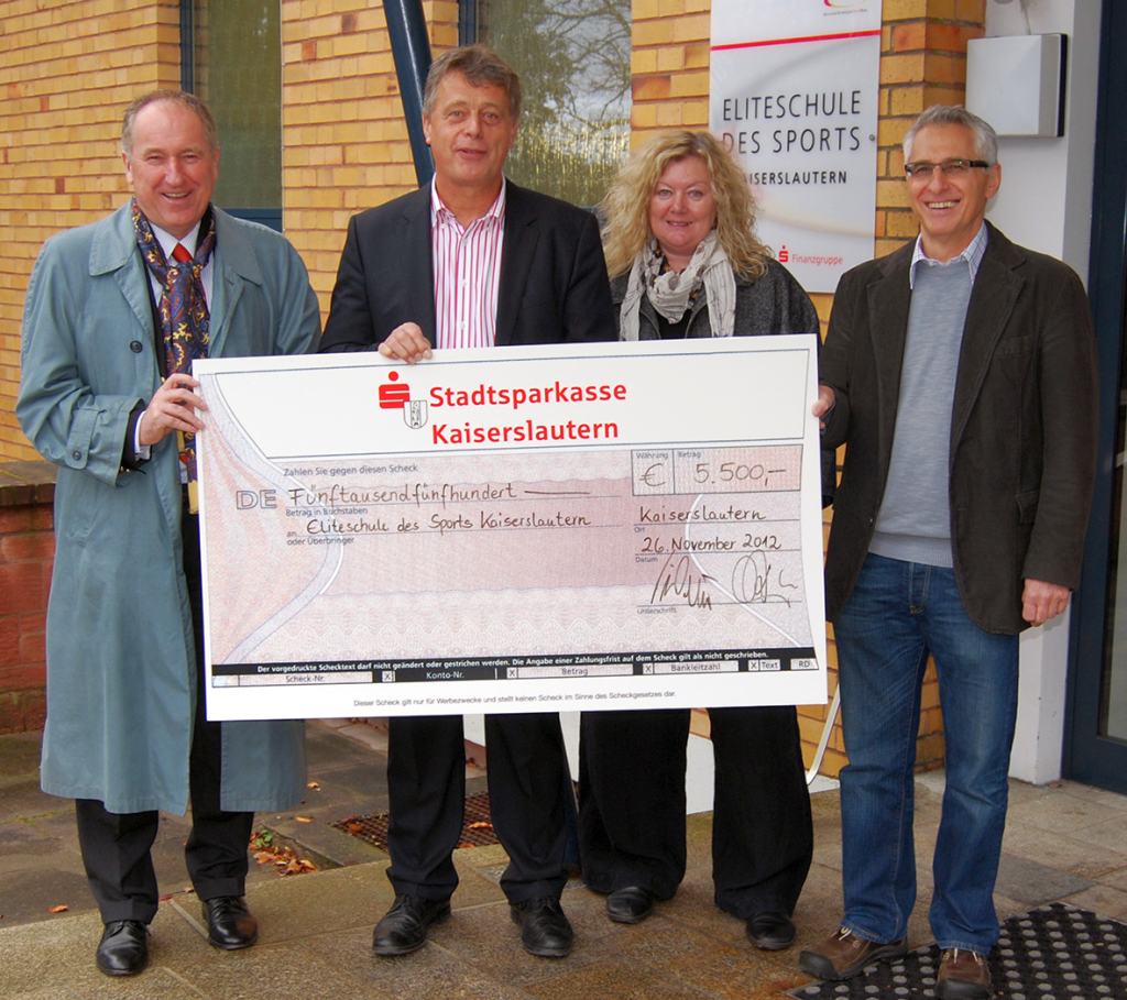 Auch in diesem Jahr wurde das Heinrich-Heine-Gymnasium Kaiserslautern als Eliteschule des Sports in die Fördermaßnahmen der Sparkassen-Finanzgruppe einbezogen. Am 26.11.2012 überreichte Karl-Heinz Dielmann als Vorstandsvorsitzender der Stadtsparkasse Kaiserslautern dem Schulleiter Dr. Ulrich Becker einen Scheck in Höhe von 5.500,- €. In Abstimmung mit dem Deutschen Olympischen Sportbund sind diese Fördermittel zweckgebunden für spezielle Projekte der Schwerpunktsportarten Badminton und Radsport am Heinrich-Heine-Gymnasium einzusetzen. Der Fokus dieser Förderung liegt aktuell auf speziellen Lehrgangs- und Wettkampfmaßnahmen, um die Sportlerinnen und Sportler an das internationale Niveau in Badminton und Radsport heran zu führen.