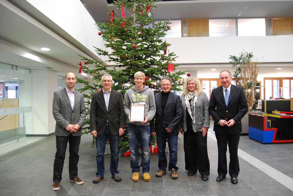 Karl-Heinz Dielmann, Vorstandsvorsitzender der Stadtsparkasse Kaiserslautern und Karin Decker, Bereichsleiterin Marketing & Öffentlichkeitsarbeit, überreichten dem Schüler eine Urkunde von der Sparkassen-Finanzgruppe und dem Deutschen Olympischen Sportbund sowie ein Geldpreis der Stadtsparkasse Kaiserslautern. In Anwesenheit von Hermann Mühlfriedel, Leiter des Sportzweigs am Heinrich-Heine-Gymnasium, Frank Ziegler, Radsporttrainer am Heinrich-Heine-Gymnasium und Frank Grimm, Vertreter des Olympiastützpunktes, wünschte Karl-Heinz Dielmann dem Schüler für die Zukunft alles Gute und weiterhin viele sportliche Erfolge.