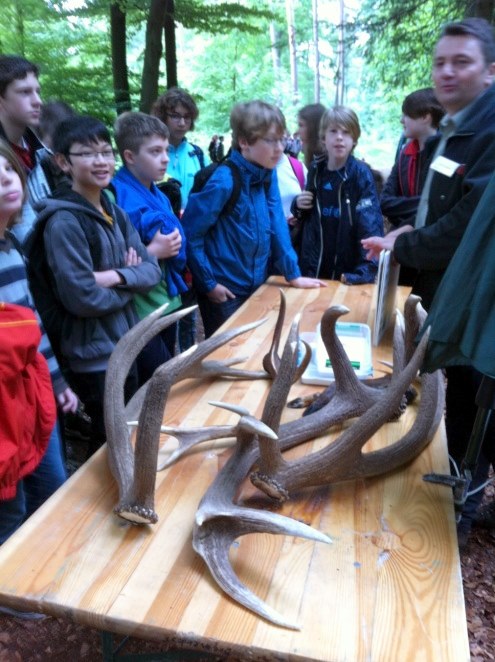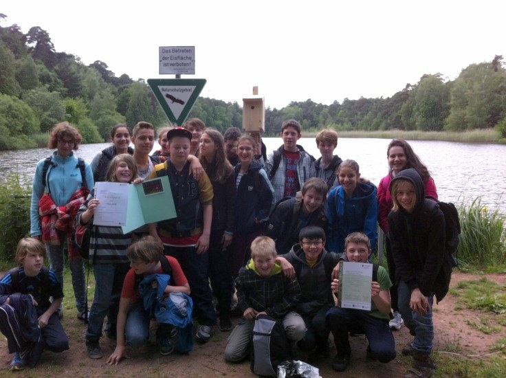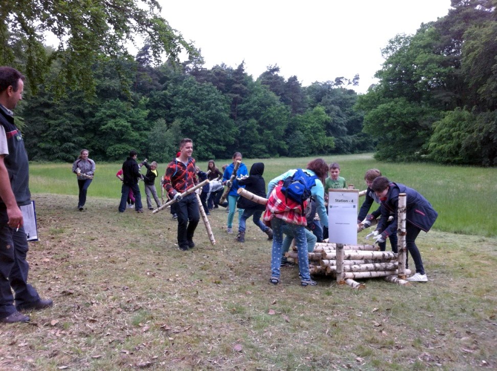 Mit dabei auch die 21 Schülerinnen und Schülern der Klasse 7h, die von ihrer Biologielehrerin, Frau Busch angemeldet und vorbereitet worden waren. Betreuer im Wettkampf war Herr Kneip. Zusammen mit einem „Forstpaten“ mussten die Schülerinnen und Schüler elf Stationen in einem Waldparcours bewältigen. Hierzu gehörte es, heimische Bäume und Tiere zu bestimmen, die Größe verschiedener Bäume zu messen sowie ihre Geschicklichkeit und ihr Teamwork in verschiedenen Spielen unter Beweis stellten. Zudem hatten die Schüler im Vorfeld ein Waldkunstwerk zu dem Thema „Traumwald“ mithilfe von Naturmaterialien gestalten müssen.