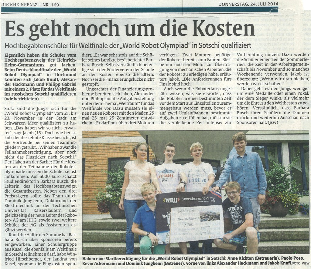 Zeitungsartikel aus der Rheinpfalz vom 24.07.2014