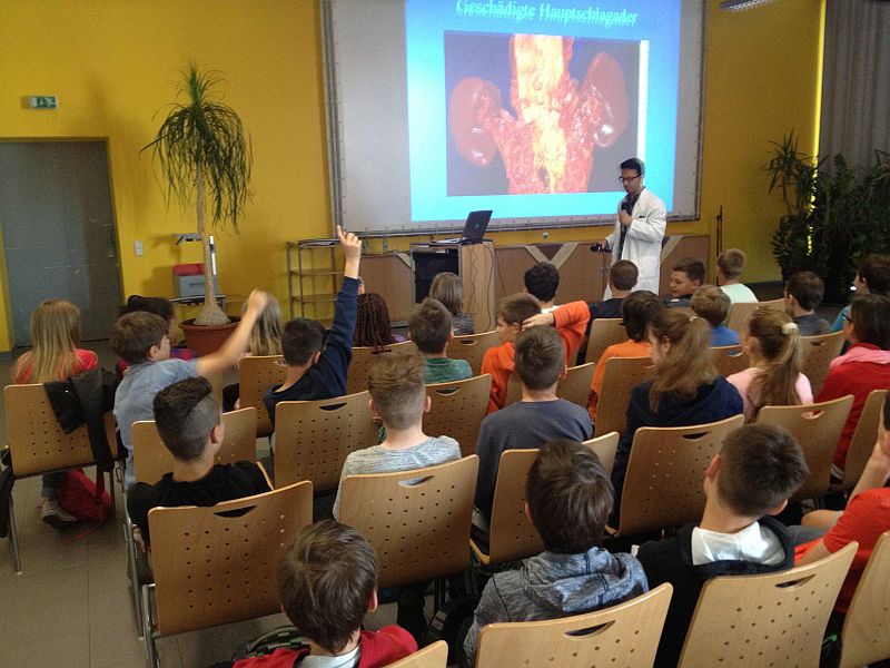 Am 21.05.2015 besuchten die 6. Klassen mit ihren Klassenlehrern und Herrn Schott, dem Suchtpräventionsbeauftragten des HHG, das Westpfalzklinikum in Kaiserslautern. Dort fand im Rahmen des Raucher-Präventions-Programms ’Nichtrauchen ist cool’ eine von Dr. Baki moderierte interaktive Informationsveranstaltung zu den Gefahren des Rauchens statt. Dr. Baki ging dabei wissenschaftlich belegt, aber für die Schülerinnen und Schüler verständlich besonders auf Aspekte wie z. B. den Zusammenhang Einstiegsalter-Spätfolgen und Konsummenge-Krankheitsbilder ein und lieferte so aufschlussreiche Fakten zum Thema Rauchen, die überrascht und betroffen machen. Darüber hinaus gab es im Anschluss Gelegenheit zum Fragenstellen, was von den Schülerinnen und Schülern eifrig wahrgenommen wurde. Auch dabei kam es zu manchem Aha-Effekt, und am Schluss waren sich alle einig: „Nichtrauchen ist cool!“