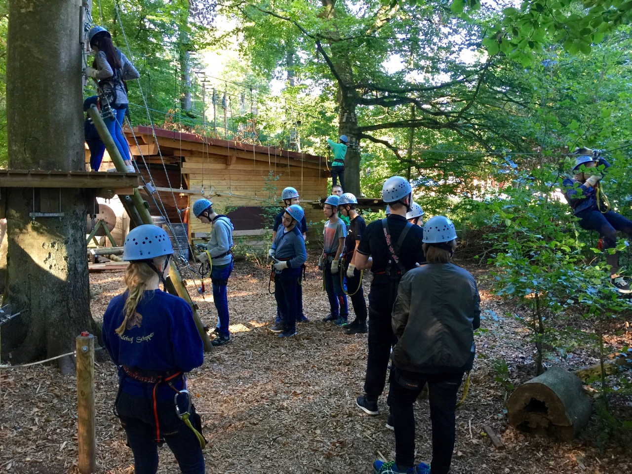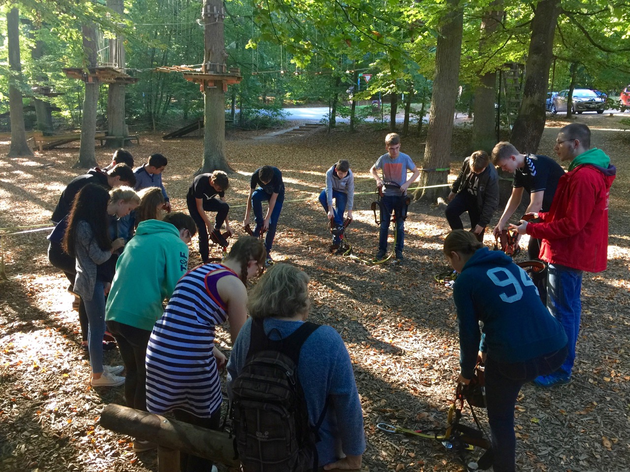 Angekommen erhielten wir bei strahlendem Sonnenschein eine Sicherheitseinweisung in die Vorschriften und Verhaltensregeln im Park. Wir wurden mit dem Klettergurt vertraut gemacht und mussten den Sicherungsvorgang einüben. An einem kleinen Übungsparcours mussten wir dann demonstrieren, dass wir alles verstanden haben. Danach durften wir am ersten Parcours in Gruppen von mind. 2 Schülern starten.