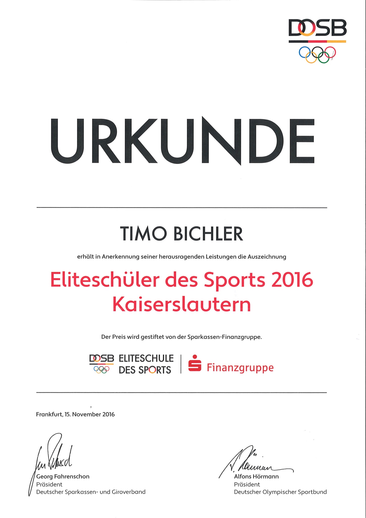 Timo Bichler wurde vom Deutschen Olympischen Sportbund und der Sparkassen Finanzgruppe als Eliteschüler des Sports 2016 ausgezeichnet. Der international erfolgreiche Bahnradsportler aus Niederbayern trainiert und lebt seit 2014 an der Eliteschule des Sports am Staatlichen Heinrich-Heine-Gymnasium in Kaiserslautern. Er tritt damit in die Fußstapfen so prominenter Sportler wie Pauline Grabosch, Lisa Klein, Jan May und Pascal Ackermann (Radsport) oder Alexander Wieczerzak und Natalia Kubin (Kubin). Timo Bichler besucht zurzeit die 12. Klasse des HHG und bereitet sich sportlich auf die Weltmeisterschaften 2017 vor.