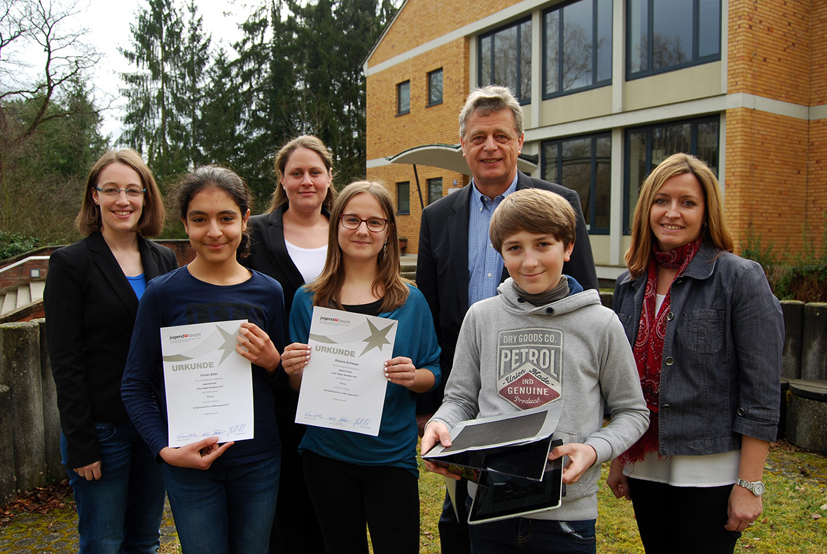 Dr. Ulrich Becker, Schulleiter des Heinrich-Heine-Gymnasiums und die betreuenden Lehrerinnen Angela Schneider und Simone Schuhmacher, freuten sich sehr über die Auszeichnung und die damit verbundenen Möglichkeiten, von dem Fördergeld neue Materialien einkaufen zu können.