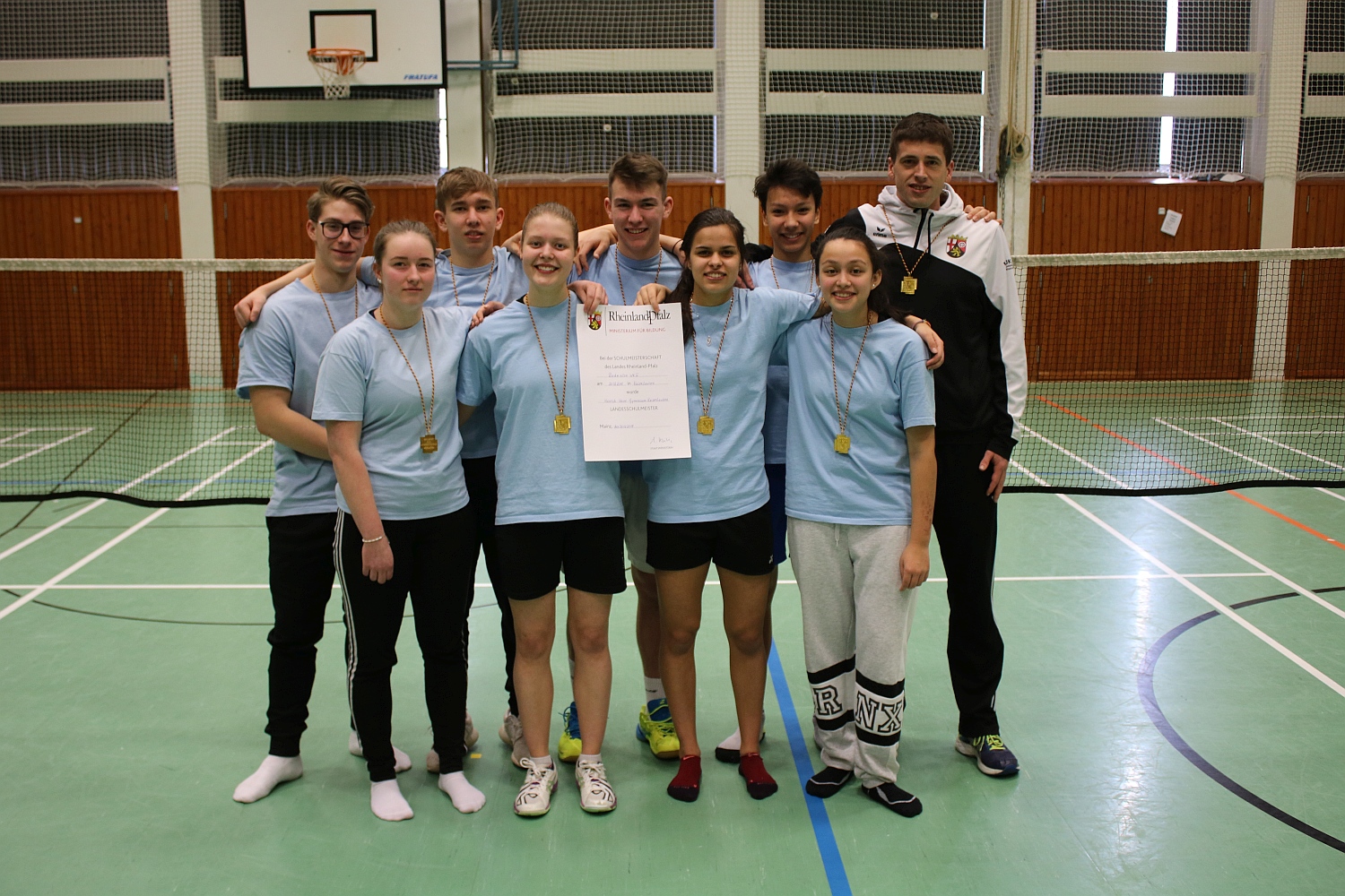 Beim Bundesfinale sind traditionell nur die Landessieger der WK II und der WK III zugelassen. Für die WK IV-Mannschaft des HHG bedeutete der Landesentscheid, der als letzter der drei Wettbewerbe am 18.04.2018 in Plaidt ausgetragen wurde, zugleich die Endstation. Aufgrund ihrer personell starken Besetzung war neben dem HHG ausnahmsweise auch das Rittersberggymnasium, als zweitplatzierte Mannschaft des Regionalentscheids, für den Landesentscheid nominiert worden. Ausgerechnet in der ersten Spielbegegnung trafen die beiden Mannschaften aus Kaiserslautern aufeinander - mit dem klaren Endergebnis von 6:0 für das HHG. In den weiteren Begegnungen, gegen Kontrahenten aus den Schulaufsichtsbezirken Trier (Friedrich Wilhelm-Gymnasium) und Koblenz (Integrierte Gesamtschule Pellenz Plaidt), war dem HHG der Landessieg, mit lediglich einem Spielverlust, nicht zu nehmen. Das Rittersberggymnasium Kaiserslautern gewann die Folgepartien ebenfalls und wurde am Ende Vizemeister.