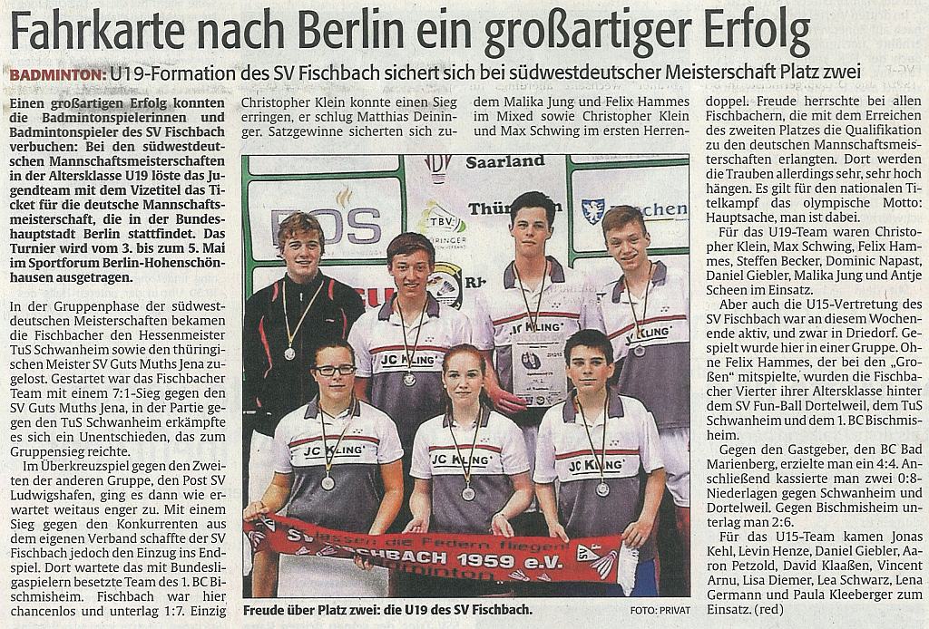 Badminton: Fahrkarte nach Berlin ein großartiger Erfolg 16.04.2013 Zeitungsartikel aus der Rheinpfalz vom 16.04.2013