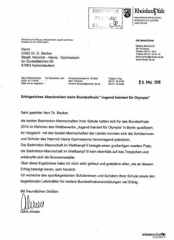 Das Jahr 2009 geht in die Annalen der Sportart Badminton am HHG (seit 1982) als eines mit den größten Erfolgen ein. Vor allem die Ergebnisse bei den Jugend-Europameisterschaften sprechen für diese Einschätzung. Gleich drei Athleten kehrten aus Mailand mit insgesamt fünf Medaillen heim. Den größten Glanz hatte die Silbermedaille von Jonas Geigenberger im Mixed, dazu errang er auch noch Bronze im Doppel und mit der Mannschaft. Alina Hammes und Richard Domke wurden mit ihren Einsätzen im Teamwettbewerb mit der Bronzemedaille belohnt. Dazu kamen noch zwei deutsche Meistertitel durch diese beiden HHG´ler.