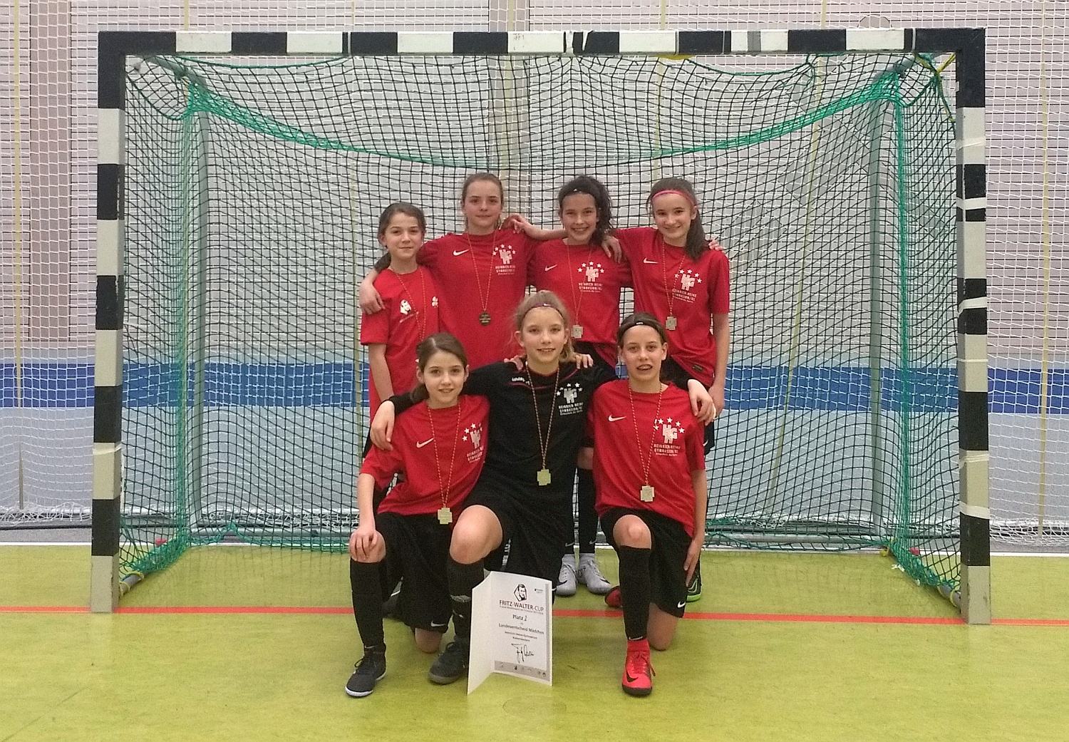Im Landesfinale des Fritz-Walter-Cups am 19.03.2018 in der Barbarossahalle Kaiserslautern verpassten die HHG-Mädchen die Titelverteidigung denkbar knapp durch ein unglückliches Gegentor nur wenige Sekunden vor Schluss. Das HHG konnte die Vorrunde mit einem 1:1 gegen die Realschule plus aus Mayen und einem 3:2 Sieg gegen die Gesamtschule Bitburg zunächst erfolgreich gestalten. Allerdings musste man den Gruppensieger aufgrund einer Punkt-gleichheit mit dem Team aus Mayen durch Penaltyschießen ermitteln. Nachdem dieses Entscheidungsschießen ebenfalls mit 3:2 gewonnen worden war, stieß man im Halbfinale auf die Maria-Ward-Schule aus Landau. Die Mädchen des HHG zeigten dort ihr ganzes Können und landeten einen ungefährdeten 4:0 Sieg, sodass der Titelverteidigung nur noch die Mannschaft des Gymnasium Bad Marienberg im Wege stand. Das HHG übernahm auch im Finale sofort die spielerische Initiative, musste aber einen 0:1 Rückstand nach einem schnellen Gegenangriff hinnehmen, den man jedoch gut zwei Minuten vor Schluss egalisieren konnte. Wer nun dachte, die Mädchen des HHG müssten ihrem hohem Tempo Tribut zollen, sah sich getäuscht. Das HHG Team spielte weiterhin konsequent nach vorne, konnte aber einen Fernschuss nach einem etwas zu kurz abgewehrten Ball, der die erneute 1:2 Führung für den Gegner bedeutete, nicht verhindern. Die verbleibenden 30 Sekunden ließen leider nicht genug Zeit für ein geordnetes Aufbäumen, sodass das Endspiel letztendlich mit 1:2 verloren ging. Insgesamt zeigten die Spielerinnen des HHG im Turnierverlauf die technisch versierteste Spielanlage aller teilnehmenden Mannschaften, ließen im Abschluss oder beim letzten Pass jedoch die letzte Präzision vermissen, weshalb in diesem Jahr die Silbermedaille und somit die Vize-Meisterschaft beim Fritz-Walter-Cup 2018 zu Buche stand. Die Enttäuschung der HHG-Mädels nach der Finalniederlage war sichtlich riesengroß, dennoch ist das Erreichen des zweiten Platzes bei Deutschlands größtem Hallenschulfußballturnier aller Ehren wert.