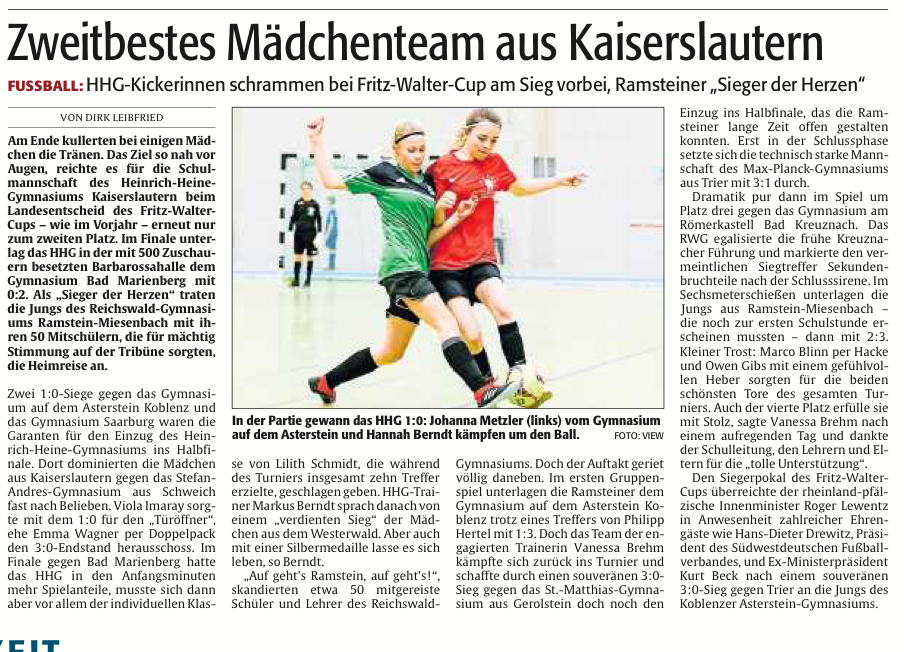 Nachdem sich die HHG-Mädchen auch in diesem Schuljahr für das Finale der neunzehnten Auflage des Fritz-Walter-Cups am 15.04.2019 in der Barbarossa-halle Kaiserslautern qualifiziert hatten, konnten sie die Vorrunde mit zwei ungefährdeten 1:0 Siegen gegen das Gymnasium Saarburg sowie das Gymnasium auf dem Asterstein aus Koblenz erfolgreich bestreiten. Im anschließenden Halbfinale traf man auf das Stefan-Andres-Gymnasium aus Schweich. Das HHG-Team ließ dabei Ball und Gegner gekonnt laufen und stellte den 3:0 Endstand bereits in der ersten Hälfte der Partie her. So stand dem Turniersieg nur noch der Titelverteidiger und Finalgegner des vorherigen Jahres, die Mannschaft des Gymnasium Bad Marienberg, im Wege. Das HHG übernahm auch im Finale sofort die spielerische Initiative und kontrollierte die extrem starke Spielmacherin des Gegners gut, konnte aber die wenigen eignen Chancen nicht in Torerfolge umsetzten. Zwei Unachtsamkeiten im HHG-Defensivspiel mündeten in der Mitte der Spielzeit leider in zwei Torchancen des Gegners, die überlegt zur 2:0 Führung ausgenutzt wurden. Das HHG Team spielte trotzdem weiterhin nach vorne, konnte aber keine zwingenden Torchancen mehr kreieren, da die Bad Marienberger die 2:0 Führung gekonnt verteidigten. Auch in diesem Jahr zeigten die Spielerinnen des HHG die technisch versierteste Spielanlage aller teilnehmenden Mannschaften, doch Bad Marienberg hatte mit Lilith Schmidt die überragende Spielerin des Turniers in seinen Reihen, deren zwei Endspieltore letztendlich zur Titelverteidigung ausreichten. Somit stand für das HHG auch 2019 die Vize-Meisterschaft beim Fritz-Walter-Cup zu Buche stand. Die Enttäuschung der HHG-Mädels nach der Finalniederlage war sichtlich riesengroß, dennoch ist das Erringen der Silbermedaille bei Deutschlands größtem Hallenschulfußballturnier ein sehr großer Erfolg, auf den die HHG-Mädchen sehr stolz sein dürfen.