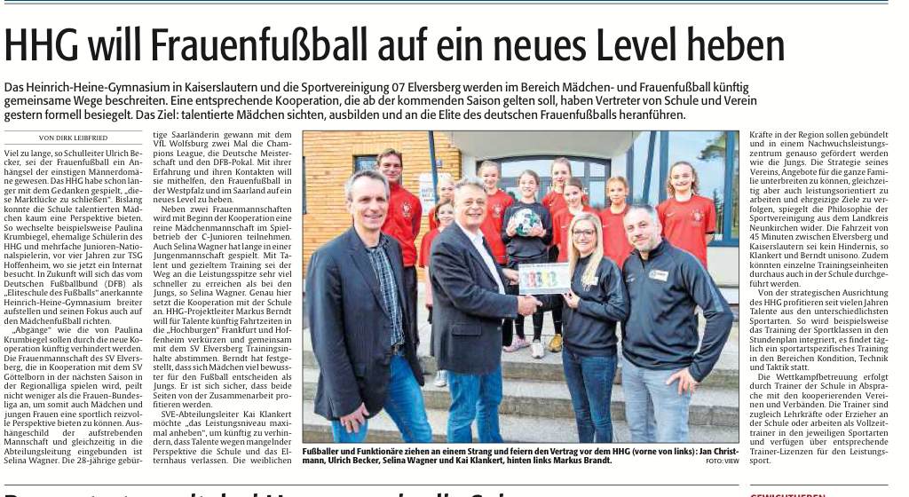 Die SV 07 Elversberg e.V. und das Heinrich-Heine-Gymnasium in Kaiserslautern haben eine Kooperationsvorbereitung im Mädchen- und Frauenfußball geschlossen. Die SVE ist vom Schuljahr 2019/2020 an offizieller Partnerverein der Eliteschule des Fußballs und somit weibliches Pendant zum 1. FC Kaiserslautern für den männlichen Bereich.