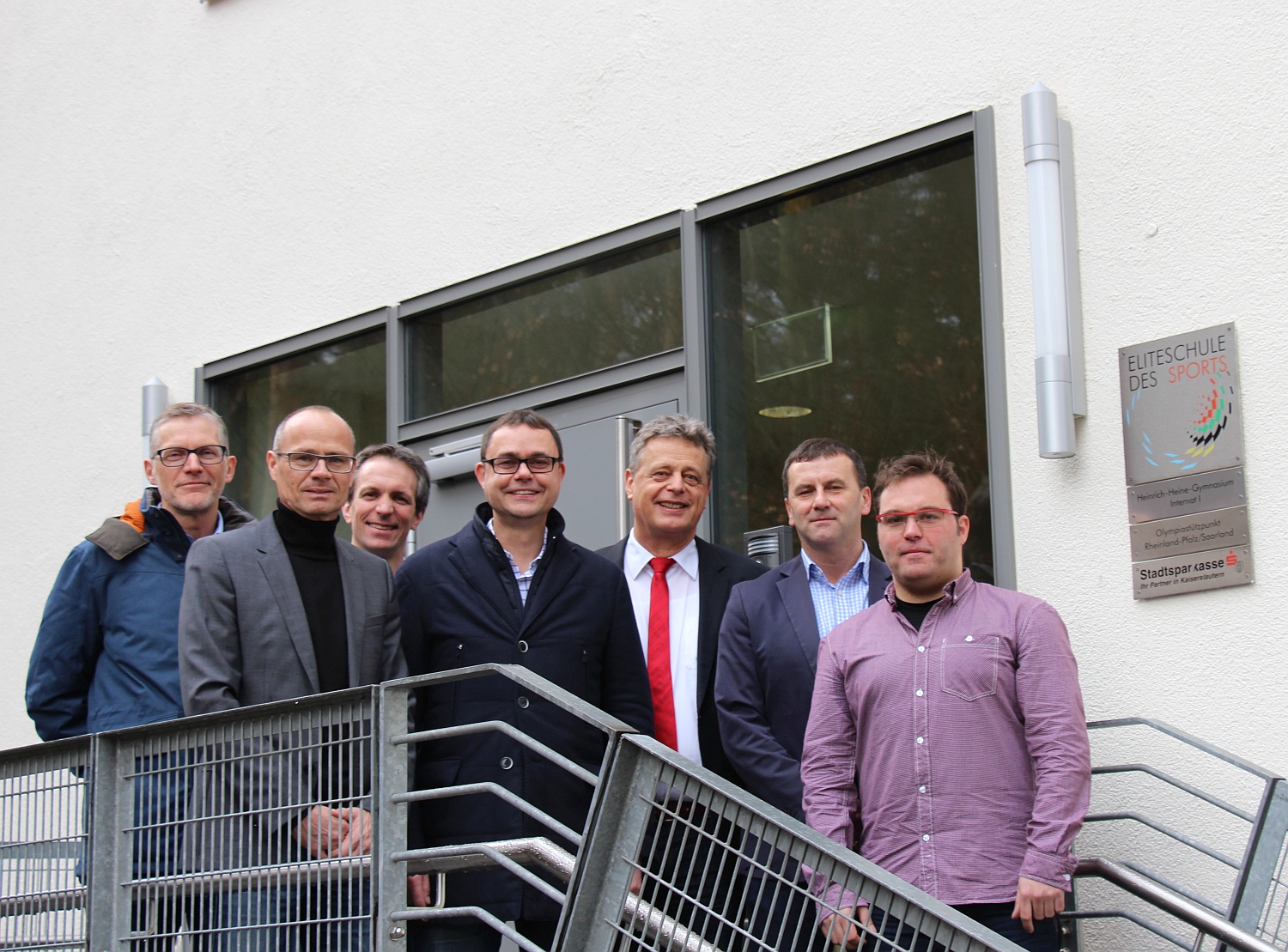 Vor dem Sportinternat (v.l.n.r.) Josef Schüller (Internatsleiter). Lars Emmermann (Stell. Schulleiter), Jan Christmann (Sportzweigleiter), Michael Klatt (Vorstandsmitglied FCK), Dr. Ulrich Becker (Schulleiter), Manfred Paula (Sportlicher Leiter NLZ), Patrik Maaß (Pädagogischer Leiter NLZ)