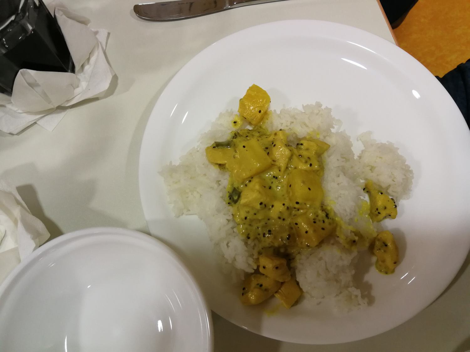 Hähnchencurry an Chiasamen und dazu Reis sowie Salat