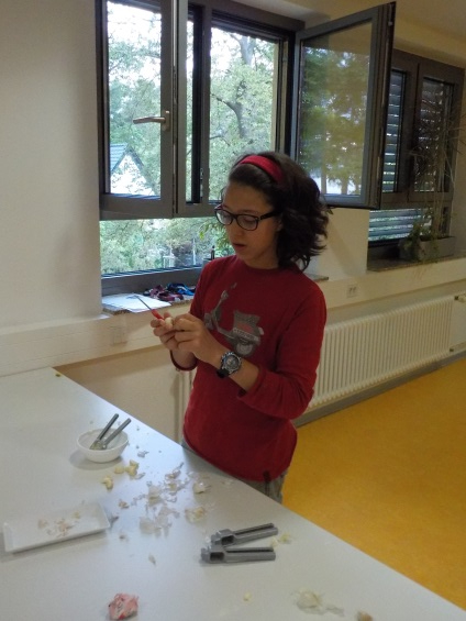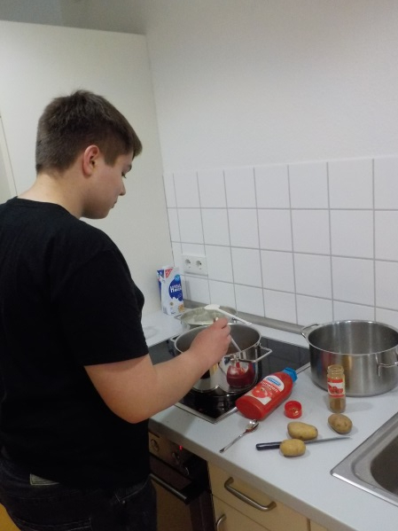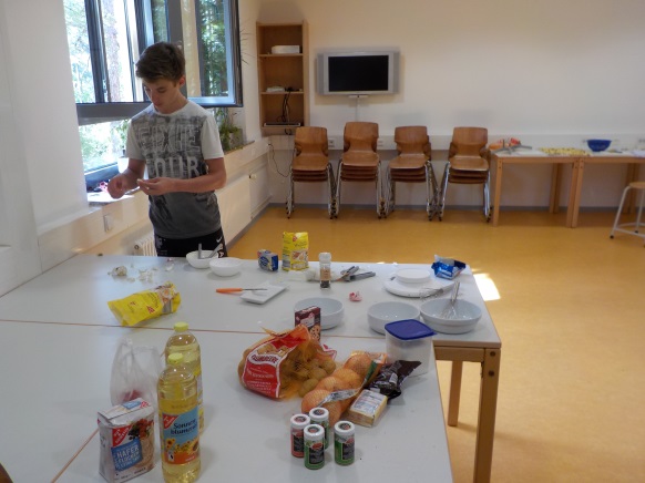 Die Teilnehmer/innen suchen gemeinsam das Rezept aus, schreiben eine Einkaufsliste, gehen gemeinsam mit Frau Hoffmann einkaufen und sind dann für die Zubereitung zuständig. Danach wird gemeinsam gegessen. Zwischendurch versucht Frau Hoffmann mit den Kids immer wieder etwas Ordnung in der Küche zu schaffen, steht für Fragen zur Verfügung oder hilft, wenn es nicht weitergeht. Nach dem Essen packen dann nochmal alle mit an und machen die Küche sauber. Die Koch AG ist eine gelungene Abwechslung zum Gang in die Mensa, da die Jungs und Mädels gerne experimentieren und Freude am eigenen Kochen haben. Und gerade das gemeinsame Essen in einer schönen Atmosphäre lässt den „Kochstress“ schnell vergessen.