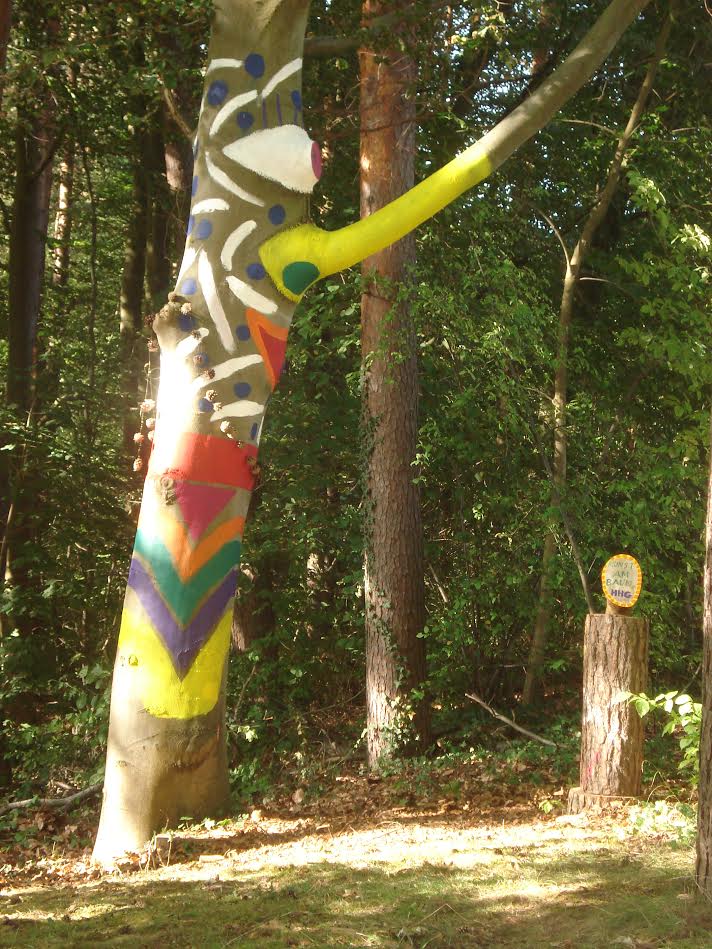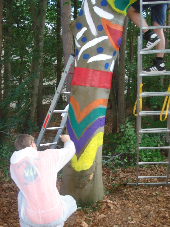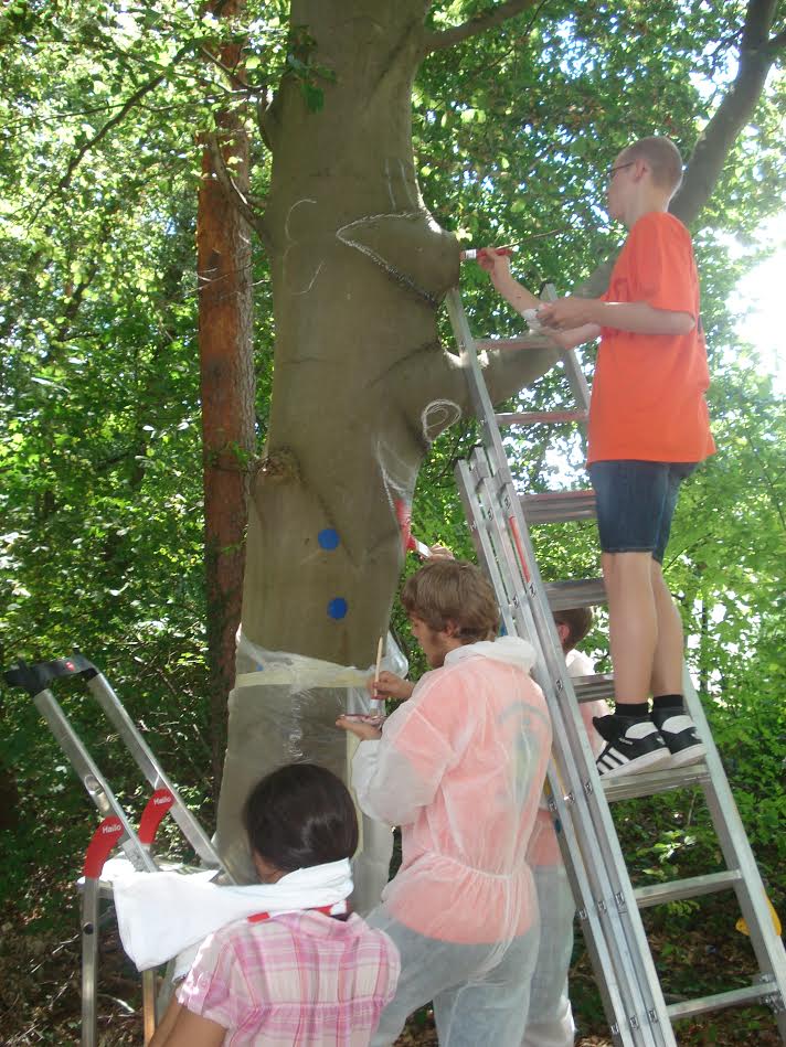 Bei dem Angebot „ Kunst am Bau(m)“ handelt es sich um ein Kunstangebot, bei dem Jugendliche einen Baum mit Verschiedenen Maltechniken ein Gesicht geben und ihre Kreativität und Fantasie freien laufen lassen sollen. Der Baum befindet sich auf dem Internatsgelände zwischen Internat- und dem Schulgebäude. Ein Baumstamm mit „ Fantasie-Gesicht“ soll künstlerisch mit Farbe verziert werden, um die Schüler mit ihrer Umwelt und ihrer Natur zu sensibilisieren. Und als selbstgestaltete „ Kunst am Bau(m)“ dargestellt werden.