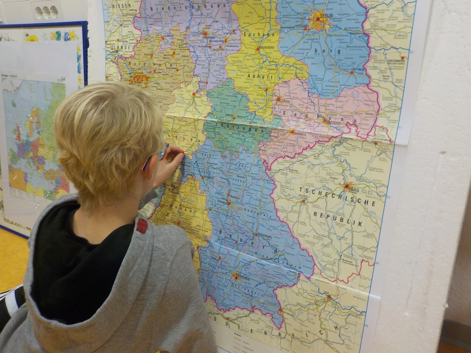 Die Kinder sollen wissen, wo sie leben, um etwas Orientierung zu gewinnen. Wichtig ist, dass sie sich dadurch räumlich besser einordnen können, denn das ist sehr wichtig für unsere Europareise. Sie soll als Grundbaustein für die nächsten Aktivitäten dienen. Das Grundwissen erreichen wir durch Karten und Flaggen, die die Kinder jeweils zuordnen müssen.