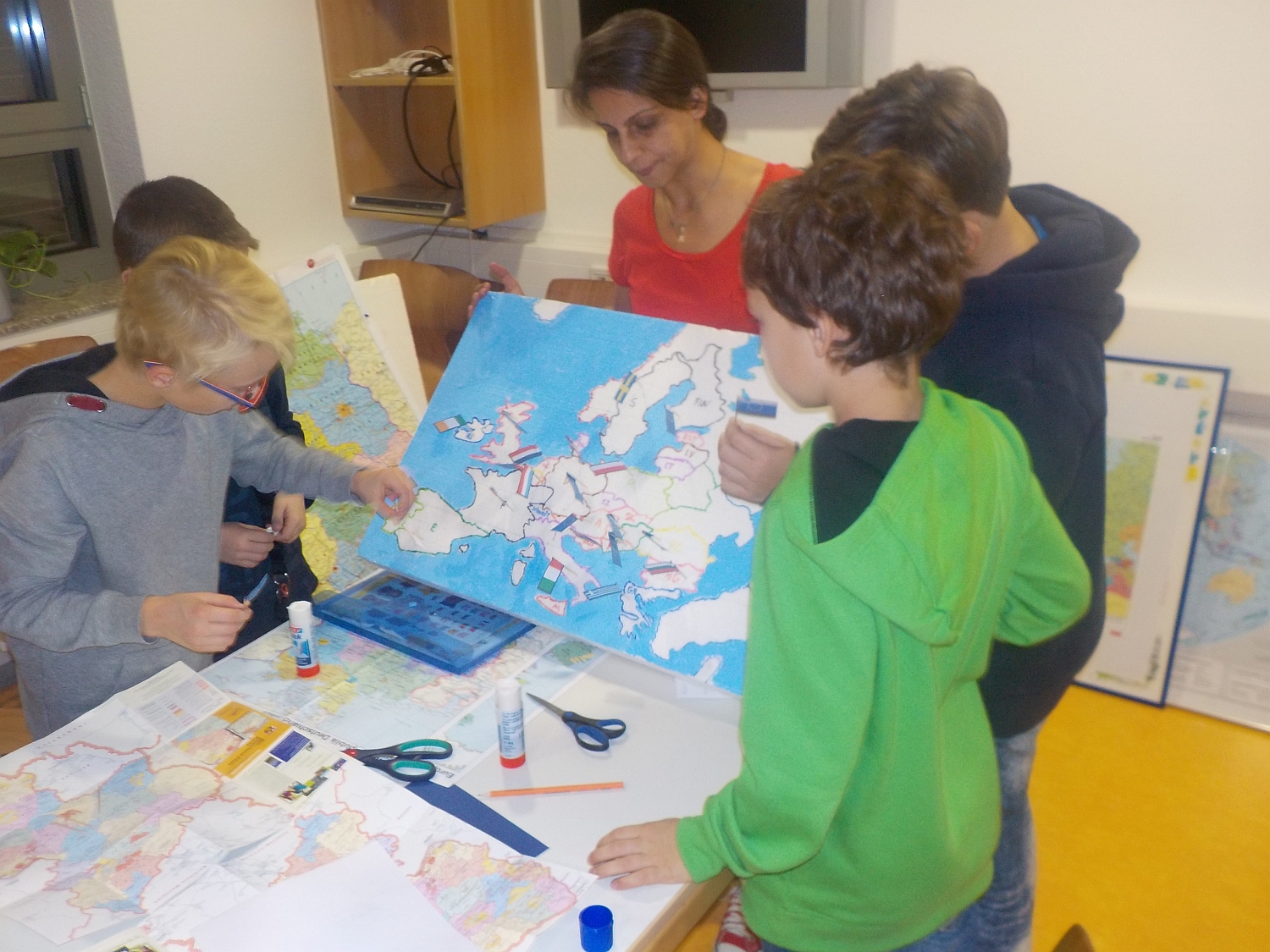 Mit Hilfe einer Europadrehscheibe konnten sie ihr Wissen erweitern und auf der Europakarte aus Styropor die Flaggen hineinstecken.