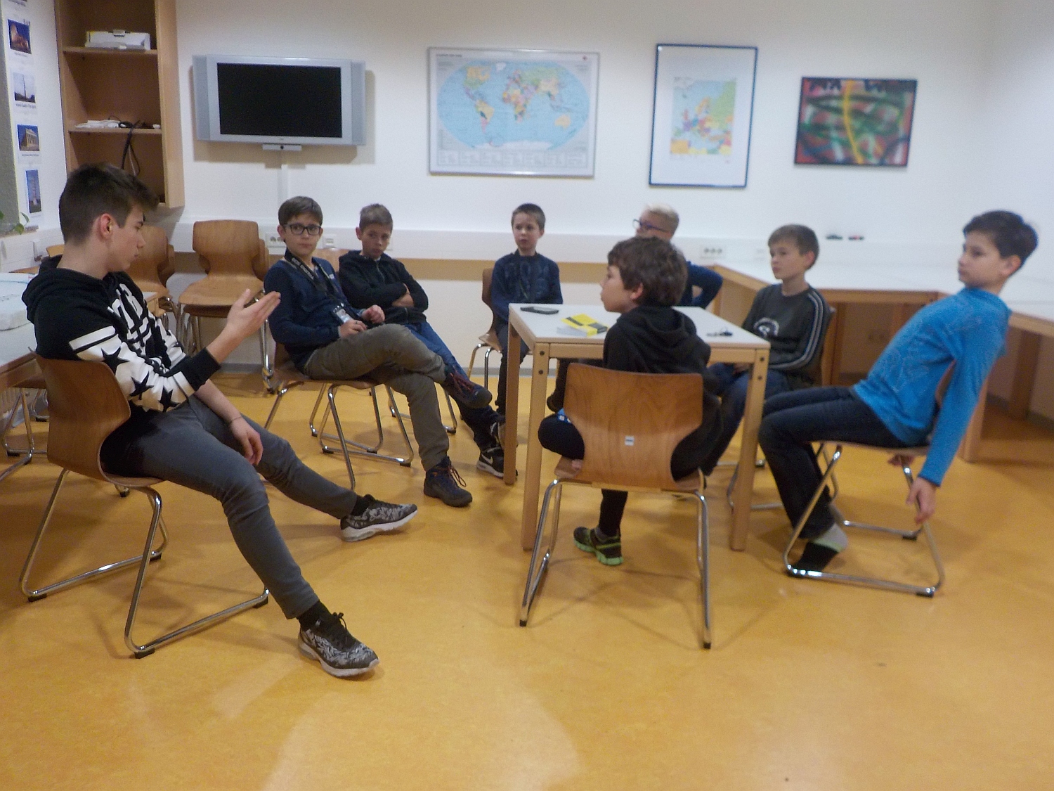 In dieser Woche gab es einen Austausch der achten Klassen mit Frankreich. Wegen der gegebenen Situation haben wir die französischen Austauschschüler/innen eingeladen, um die gegenseitige Kultur und den gegenseitigen Alltag kennen zu lernen. Wir haben einen Stuhlkreis in unserem Europazimmer gemacht und haben eine kleine Runde mit interessanten Fragen durchgeführt. Die Kinder waren sehr aufmerksam und haben sich aktiv beteiligt. Es war eine gute Möglichkeit Fragen zu stellen, die man nicht einfach im Internet oder in Büchern lesen kann.