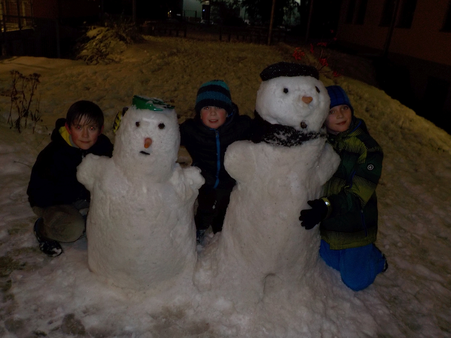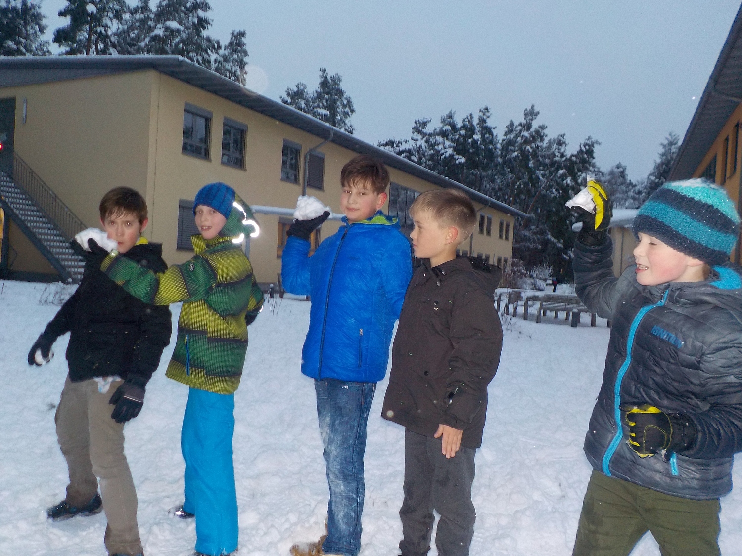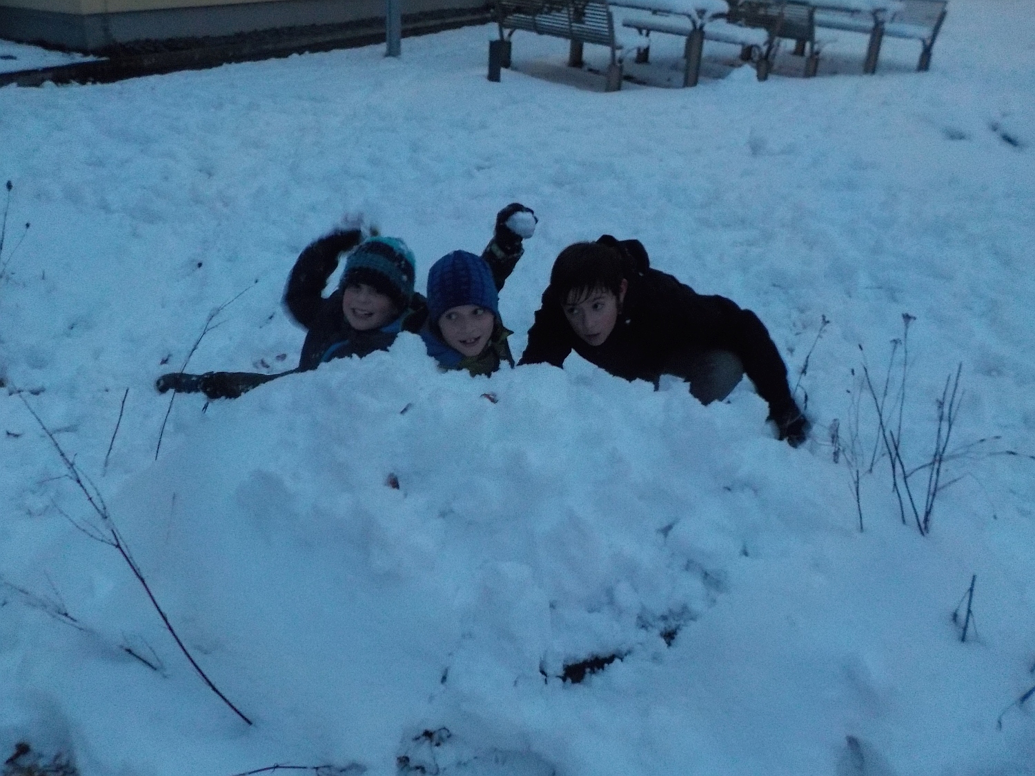 Da es bei uns sehr stark geschneit hat, bot es uns die Möglichkeit, die Alpen mit dem Schnee zu modellieren. Wir haben uns an einem Bild orientiert und versucht die Formen nachzustellen. Unsere Alpen waren natürlich viel kleiner! Selbstverständlich muss man bei Schnee auch eine Schlacht machen! Und der Mont Blanc hat uns dabei geholfen uns zu verstecken. Und da er auch nicht allzu klein war, konnten wir ihn sogar besteigen!