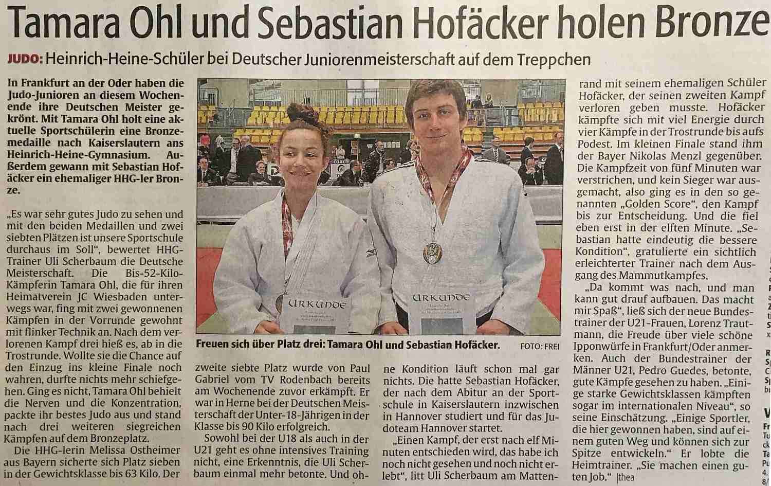 Judo: Tamara Ohl und Sebastian Hofäcker holen Bronze