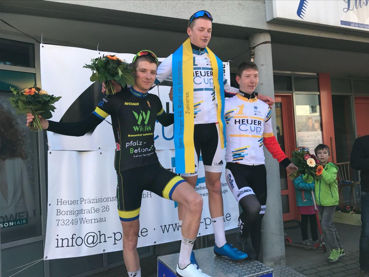 Die U19-Bundesliga-Saison beginnt für das Team Wipotec Rheinland-Pfalz erst in drei Wochen in Düren, aber die Mannschaft von Sportchef Andreas Märkl hat am Osterwochenende schon kräftig abgeräumt, wenn auch teilweise in Vereinstrikots. Am Sonntag belegten beim internationalen Grand Prix Bob Jungels in Luxemburg Marius Mayrhofer und Lukas Märkl (12s) aus einer Achter-Spitzengruppe die Plätze eins und zwei. Nach 130 Kilometern kamen die beiden solo ins Ziel. Elf Fahrer hatten Märkl und der zweite Sportliche Leiter Frank Plambeck am Start, im Wipotec-Trikot und im Trikot des RSC Linden. Kaum daheim, ging’s am Montag um sechs Uhr nach Schönaich zum traditionellen Frühjahrsklassiker über 90 Kilometer. Die Neuzugänge aus Hamburg und Schüler am Heinrich-Heine-Gymnasium in Kaiserslautern, Lennart Rilling (11s) und Frederick Raßmann (12s), gewannen das Rennen, Moritz Plambeck wurde Vierter, Marius Mayrhofer Sechster. Andy Märkl: „Das waren bärenstarke Auftritte unserer Fahrer und eine tolle Teamarbeit.“