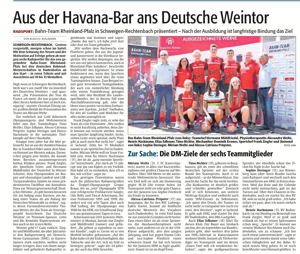 Radsport: Vorstellung des Bahn-Teams Rheinland-Pfalz Mit freundlicher Genehmigung der Rheinpfalz (10.07.2018) und Klaus Kullmann und VAN