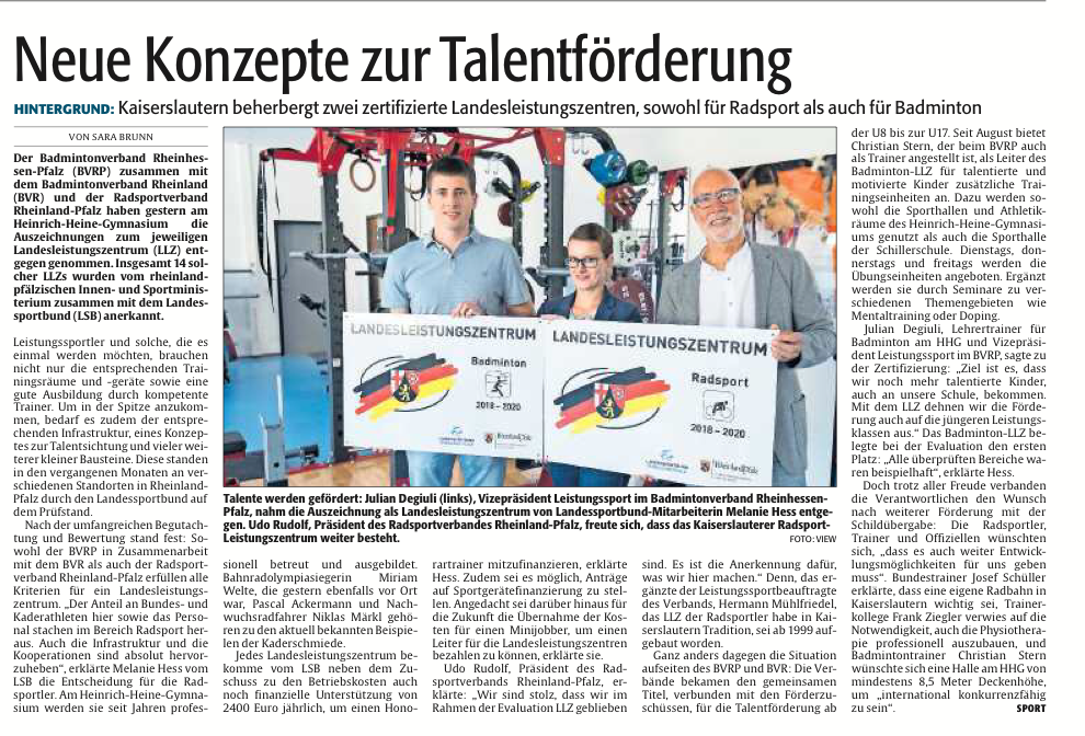Landesleistungszentren im Badminton und Radsport offziell anerkannt Mit freundlicher Genehmigung der Rheinpfalz und von View