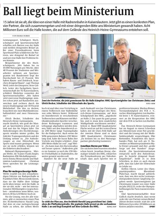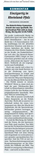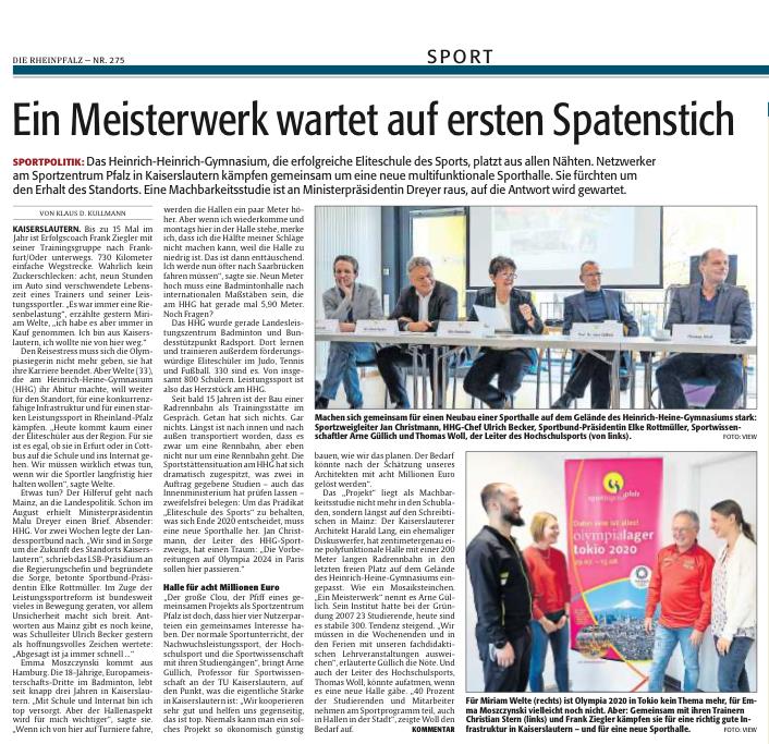 Die Rheinpfalz (Ausgabe 27.11.2019) berichtet auf der Titelseite, im Hauptsport und auf der Titelseite des Lokalteils von gestrigen Pressekonferenz des Sportbundespfalz zum Thema "Sportstättenerweiterung am Heinrich-Heine-Gymnasium".