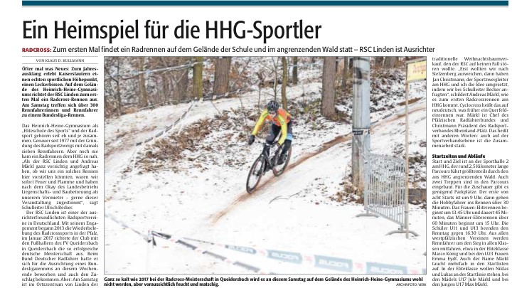 Der Countdown bis zum Heimspiel für die Radsport läuft. Ab Samstag 9 Uhr geht es los mit Cyclocrossevent auf dem HHG-Gelände.