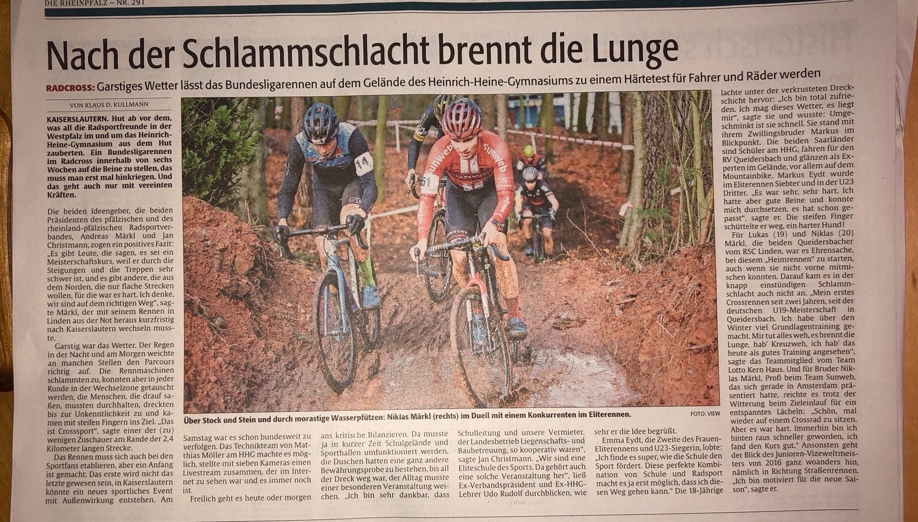 Technisch und konditionell sehr anspruchsvoll war der Kurs bei dem ersten ersten Querfeldeinrennen am Heinrich - Heine - Gymnasium. Von 9 -17 Uhr waren rund 300 Teilnehmerinnen und Teilnehmer in den Kategorien Hobby, Master, Schüler, Jugend, Junioren und bei den Eliterennen am Start. Lob gab es vom Vizepräsidenten des Bundes Deutscher Radfahrer Günter Schabel sowohl für das Organisationsteam um Andreas Märkl, wie auch das Livestreamteam um Matthias Möller. Die Rennen ist in voller Länge unter https://www.youtube.com/watch?v=6XqNdAi2SvY abrufbar. Der Saarländische Rundfunk und SWR berichteten von dem SWK-Eliterennen der Frauen und dem von Frogblue gesponserten Bundesligarennen der Männer.
