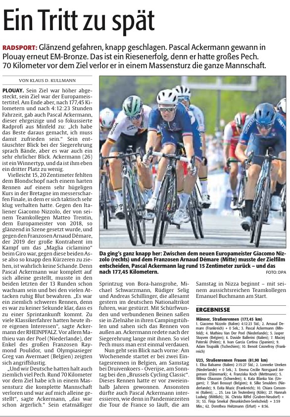 Dänischer und italienischer Sieg bei den Junioren-Rennen der Straßen-EM in Plouay: Bei den Männern gewann Kasper Andersen, bei den Frauen Eleonora Camilla Gasparrini. Hier wurde Lucy Mayrhofer (Gomaringen) gestern als 15. beste Deutsche, Lea Waldhoff (Ludwigshafen/RIG Vorderpfalz, 13s) landete auf Rang 39. Bei den Junioren verpasste der Ansbacher Marco Brenner knapp den Sprung aufs Medaillenpodium, er wurde im Sprint Vierter. Der Herschberger Moritz Kärsten (RSC Linden, 11s), wie Lea Waldhoff Eliteschüler am Heinrich-Heine-Gymnasium in Kaiserslautern, wurde 30. Im Zeitfahren belegte Moritz Platz den 14. Platz bei seinem ersten internationalen Auftritt.