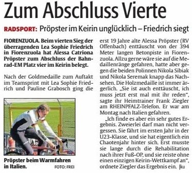 Neben Alessa-Catriona Pröpster war Lea Waldhoff (13s) ebenfalls bei der EM in der Klasse U 19 am Start. Die Gewinnerin der Bronzemedaille bei den Deutschen Straßenmeisterschaften in Bruchsal belegte den 9.Platz im Scratchrennen und einen starken 6. Platz im Madison (Zweiermannschaftszeitfahren).