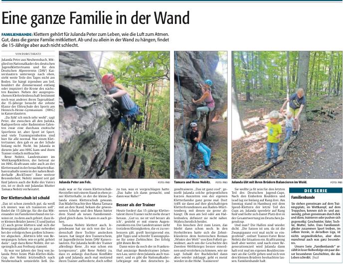 Julanda Peter aus Neuhemsbach, Mitglied im Nationalkader des deutschen Jugendkletterteams und für den Deutschen Alpenverein (DAV) Kaiserslautern unterwegs nach oben, steht weite Teile des Tages nicht am Boden. Sie hängt irgendwo am Seil, bouldert die Zimmerwand entlang oder inspiziert die Krone des nächsten Baumes. Neben der ausgesprochenen Kletterleidenschaft bestimmt noch was anderes ihren Tagesablauf: die 15-Jährige besucht die zehnte Klasse der Eliteschule des Sports am Heinrich-Heine-Gymnasium (HHG) in Kaiserslautern. „Da fühl’ ich mich sehr wohl“, sagt Peter, die zwischen all den Judoka, Radsportlern oder Badminton-Talenten zwar eine durchaus exotische Sportlerin ist, aber Sport ist Sport, und viele Trainingseinheiten sind hier für alle normal. Nur einen Klettertrainer, den gab es an der Schule bislang nicht. Nicht, bis Julanda in diesem Jahr ans HHG kam und ihren Trainer einfach mitbrachte. Rene Nobitz, Landestrainer im Wettkampfklettern, der betreut sie im HHG-Kraftraum oder auch an der Kletterwand in der benachbarten Barbarossahalle sowie in der nahen Boulderhalle „RockTown“. Eine weitere Besonderheit, Nobitz nimmt seit gut fünf Jahren auch die Rolle des Vaters ein, ist er doch mit Julandas Mutter Tamara Nobitz verheiratet. Der Kletterschuh ist schuld„Das ist schon ziemlich gut, da weiß ich immer, was ich trainieren soll“, findet die 15-Jährige, für die das Miteinander im Familienverbund ein Gewinn ist, zu dem auch gehört, dass ihre kleinen Brüder Juven (3) und Justus (2) auch gerne klettern und sich die Bewegungsabläufe so ganz nebenbei bei der erfolgreichen großen Schwester abgucken. „Klettern lebt von Bewegungen. Sehen, wie es geht, gehört dazu“, sagt dazu Rene Nobitz, der ursprünglich aus Freiburg stammt. Es war vor Jahren der Sieg von Julanda Peter beim Pfalz-Kletter-Kids-Cup, der Nobitz letztendlich nach Neuhemsbach umsiedeln ließ. Damals war er für einen Kletterschuh-Hersteller mit einem Stand in eben jener Kletterhalle, in der die kleine Julanda einen Kletterschuh gewann. Das Mädel brachte ihre Mama Tamara mit an den Stand, bekam die gewonnenen Schuhe und den Mann hinter dem Stand als neues Familienmitglied gleich dazu. So kann es auch gehen. Tamara Nobitz klettert auch. Irgendwann hat sie sich von der Leidenschaft ihrer Tochter anstecken lassen, hat längst den Trainerschein, ist Jugendleiterin beim DAV Kaiserslautern. Für Julanda heißt der Trainer allerdings Rene. „Es war schon ein Lernprozess“, gibt Rene Nobitz zu, dass es anfangs durchaus Konflikte gab und Julanda auch mal motzend ihren Trainer aufforderte, doch selbst zu tun, was er vorgeschlagen hatte. „Das habe ich dann gemacht, und dann war Ruhe!“ Besser als der TrainerHeute fordert das 15-jährige Klettertalent ihren Trainer nicht mehr derart heraus. „Gut so, sie ist viel besser als ich“, gesteht er mit einem Augenzwinkern ein. Der Landestrainer sieht trotzdem Kleinigkeiten, die es zu verbessern gilt, greift korrigierend ein, gibt Tipps und schreibt Trainingspläne für seine Ziehtochter. Der Erfolg gibt ihnen Recht. Dann wäre da noch der in Frankenthal ansässige Bundestrainer Johannes Lau, unter dem Julanda auch trainiert, und es gibt die Nationalkader-Lehrgänge mit den deutschen Jugendtrainern. „Das ist ganz cool“, genießt Julanda solche gelegentlichen kurzen Auszeiten von der eigenen Kletterfamilie ganz gerne mal. Dort trifft sie dann auf ihre gleichaltrigen Kletterfreundinnen aus Baden-Württemberg, mit denen sie gerne abhängt. Ob nun am Seil oder am Hallenboden, definiert sie nicht näher. Wahrscheinlich beides. Ein bisschen Zeit zum Lesen, das bleibt dann schon noch. In den Herbstferien hatte sich die Zehntklässlerin dem historischen Roman „Winter der Welt“ von Ken Follett gewidmet, auch um die Geschichte des Zweiten Weltkrieges besser einordnen und verstehen zu können, wie sie sagt. Sobald der Buchdeckel dann aber wieder zuklappt, geht es meist wieder in die Höhe. Trainieren! Sie wollte ja fit sein für den letzten Teil des Deutschen Jugend-Cups. Nach den Einheiten Bouldern und Lead lag sie bislang auf Rang drei. Am Sonntag stand in Hamburg mit dem Speed-Klettern der letzte Teil des Cups an. Julanda speedete auf Rang fünf und holte sich damit Platz drei in der Gesamtwertung im Deutschen Jugendcup. Und nun? Die Hallen sind wieder dicht. „Die Saison ist um, da ist die Zwangspause erst mal nicht so eingreifend“, ordnet Trainer-Vater Rene Nobitz die Situation ein. Krafttraining läuft aber weiter, und nach einer Regenerationszeit wird Julanda dann halt erst mal im eigenen Boulderzimmer an die Griffe gehen und sich von den kleinen Brüdern beobachten lassen. Familienbande halt.