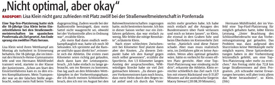 Radsport: Nicht optimal, aber okay Zeitungsartikel aus der Rheinpfalz vom 25.09.2014Mit freundlicher Genehmigung von Frau Sophie Lacher.