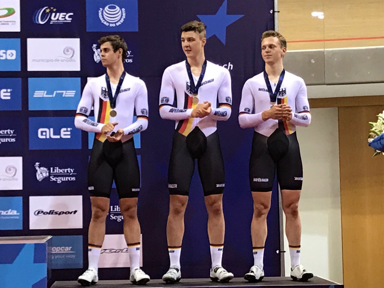 Am ersten Tag der Bahnrad EM der Junioren in Anadia (Portugal) sicherten sich das deutsche Trio um Timo Bichler, Elias Edbauer und Carl Hinze die erhoffte Medaille. Nachdem sie in der Qualifikation die Viertschnellsten gewesen waren und im Halbfinale den Russen, die einen neuen Weltrekord aufgestellt haben, unterlagen, konnten sie das Kleine Finale gegen Frankreich (46,196) in 45,406 Sekunden mit sechs Zehntelsekunden Vorsprung souverän gewinnen und holten damit Bronze. Timo knackte in 17,78 den Juniorenweltrekord unseres Olympiasiegers Philip Hindes auf der ersten Runde. Wir gratulieren und drücken Elias für seine noch folgenden Einzelstarts die Daumen!