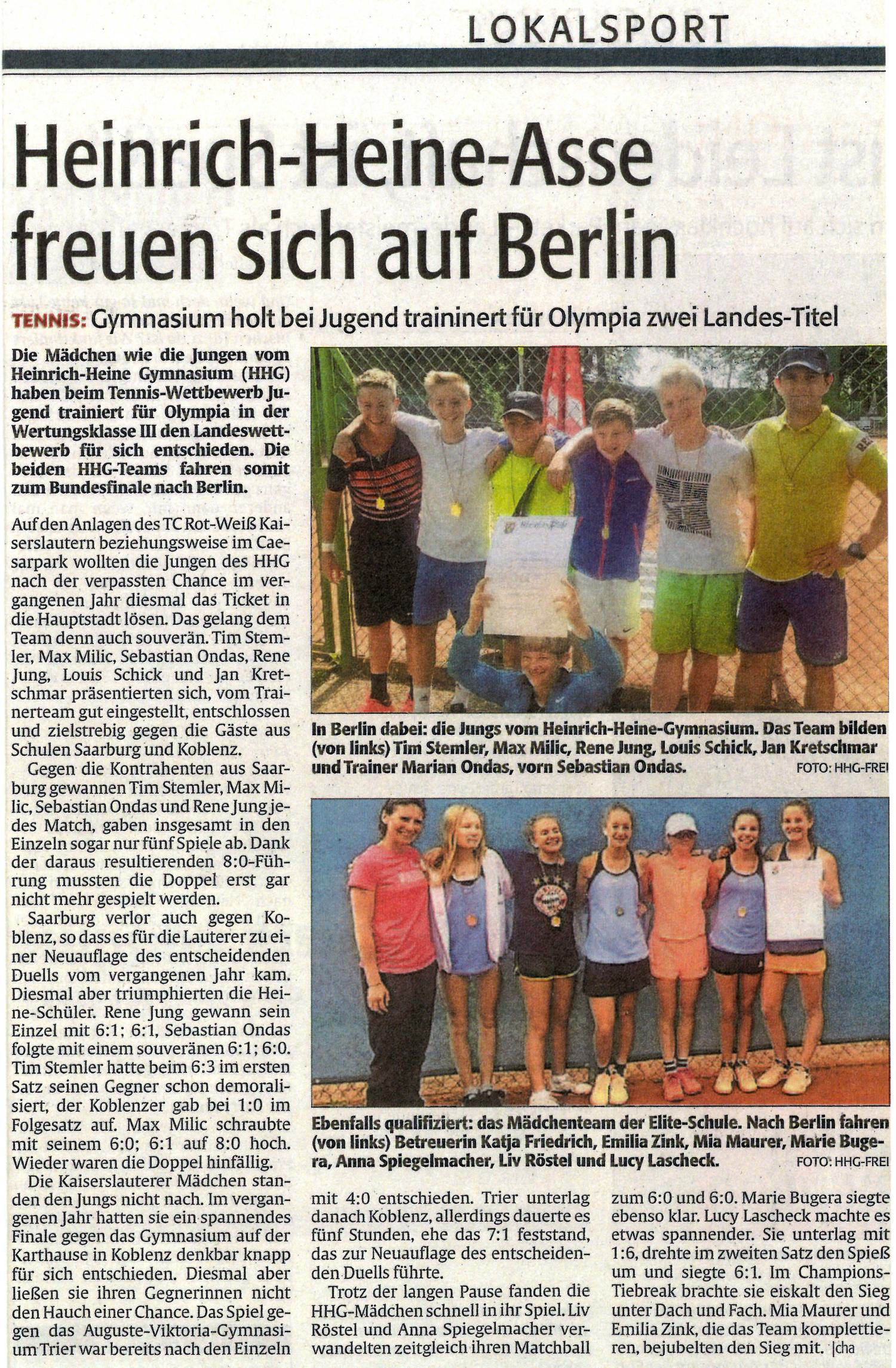 Tennis: Heinrich-Heine-Asse freuen sich auf Berlin 27.06.2018 Zeitungsartikel aus der RheinpfalzMit freundlicher Genehmigung.