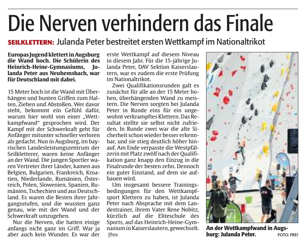 Klettern: Julanda Peter bestreitet ersten Wettkampf im Nationaltrikot 25.09.2020 Mit freundlicher Genehmigung der Rheinpfalz und Doris Theato