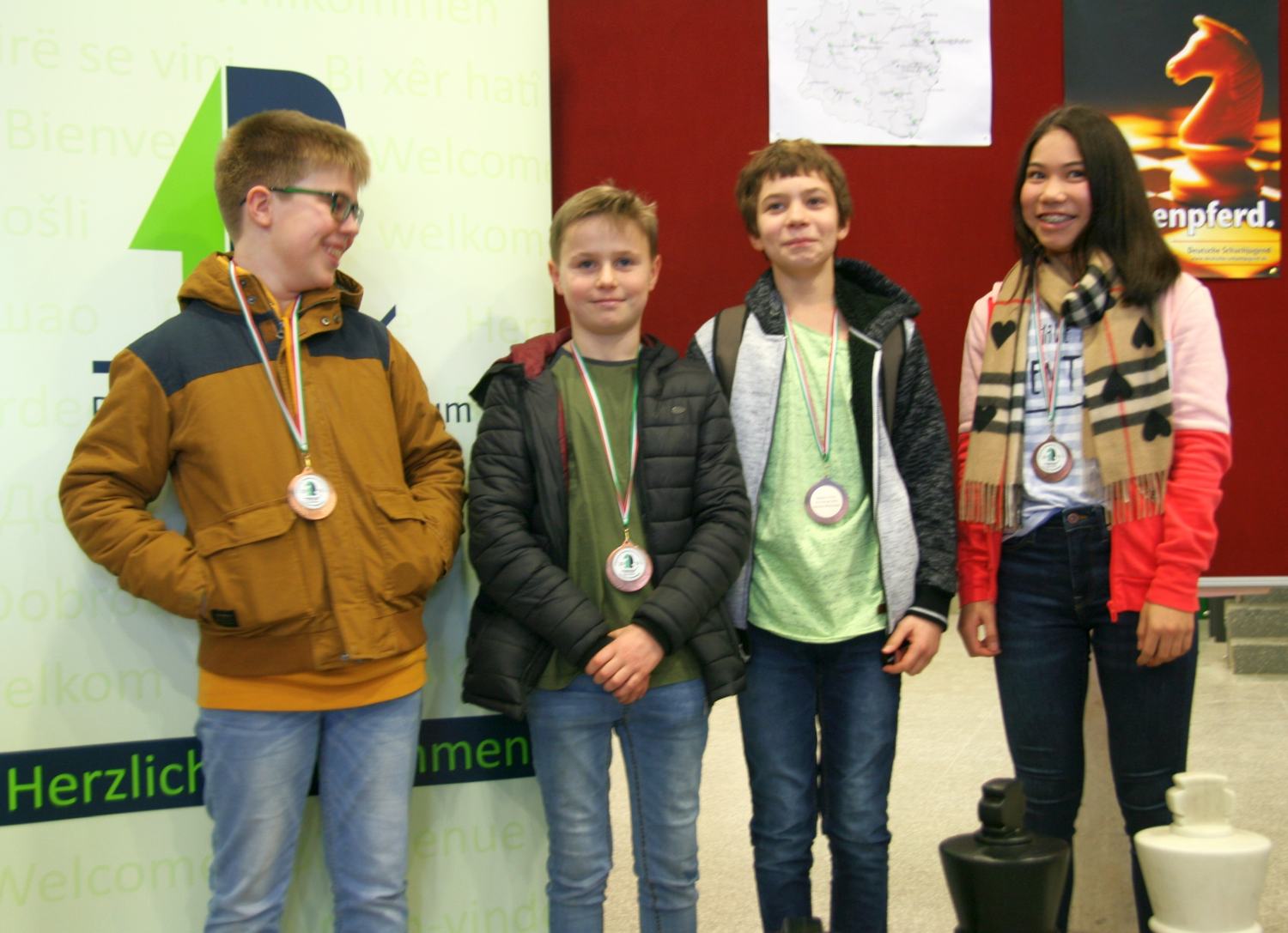 Ein starkes Turnier spielte HHG1 (Rasmus Wannenmacher, Benjamin Fieker, Aaron Patschula, Sofie Grimm), mit Platz 4 wurde die Qualifikation für die Rheinland-Pfalz-Meisterschaft nur knapp verpasst. Nach verhaltenem Start arbeitete sich das Team stetig nach vorne und bekam in den letzten 3 Runden die stärksten Gegner vorgesetzt. Gegen den überlegenen Turniersieger HSG KL war wenig auszurichten, aber Burg KL und IGS Landau wurden besiegt, sodass wir mit diesen Schulen punktgleich waren. Schließlich gab die Brettpunktwertung leider den Ausschlag gegen uns, die erwähnten Mannschaften belegten die Plätze 2 und 3. Topscorer war Aaron: Er blieb mit 5 Siegen, 2 Remisen unbesiegt.