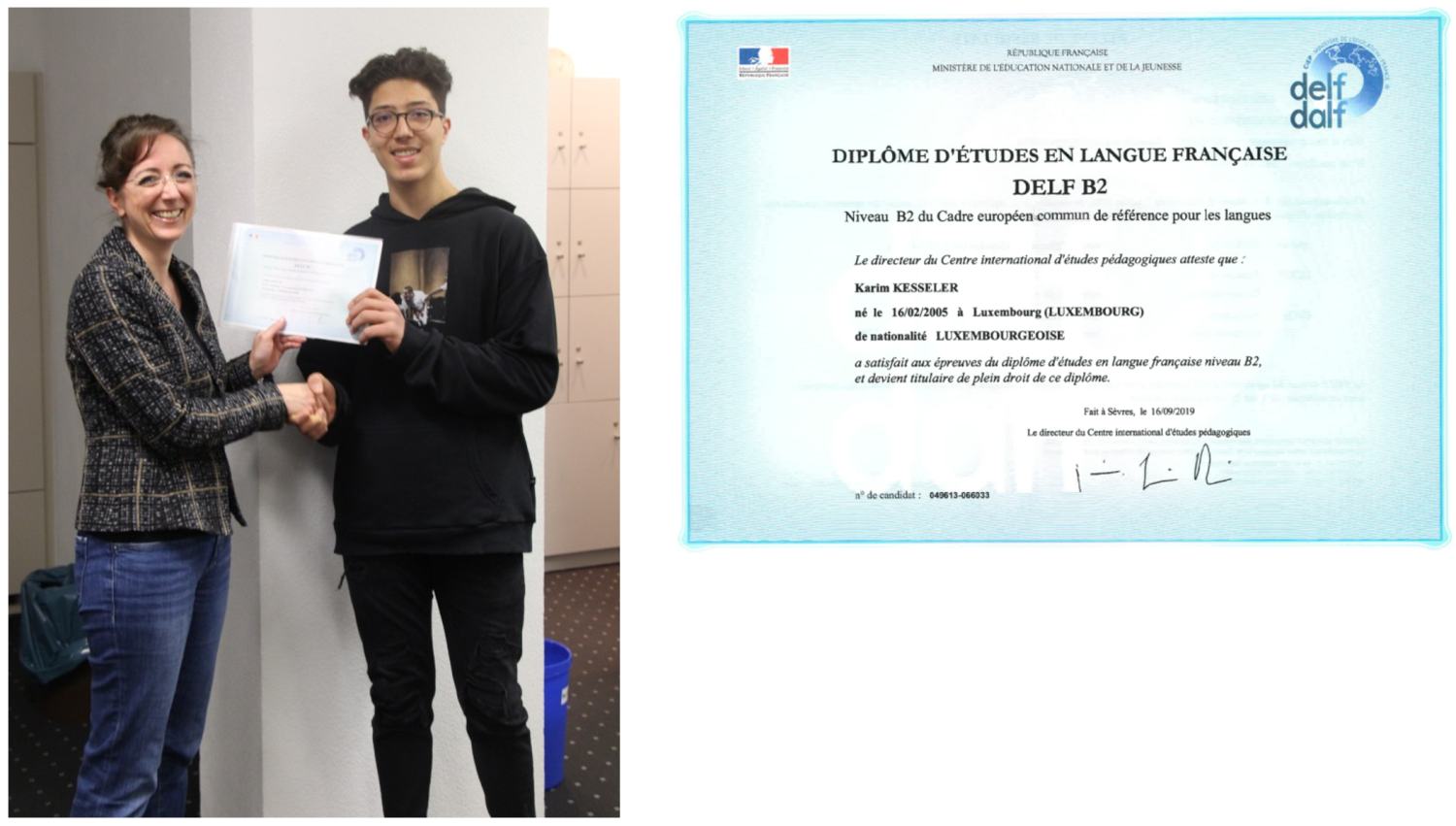 (Be) Karim Kesseler (12h) erhielt nach schriftlicher und mündlicher Prüfung das DELF-Zertifikat B2, eine außergewöhnliche Leistung für einen 14-Jährigen.