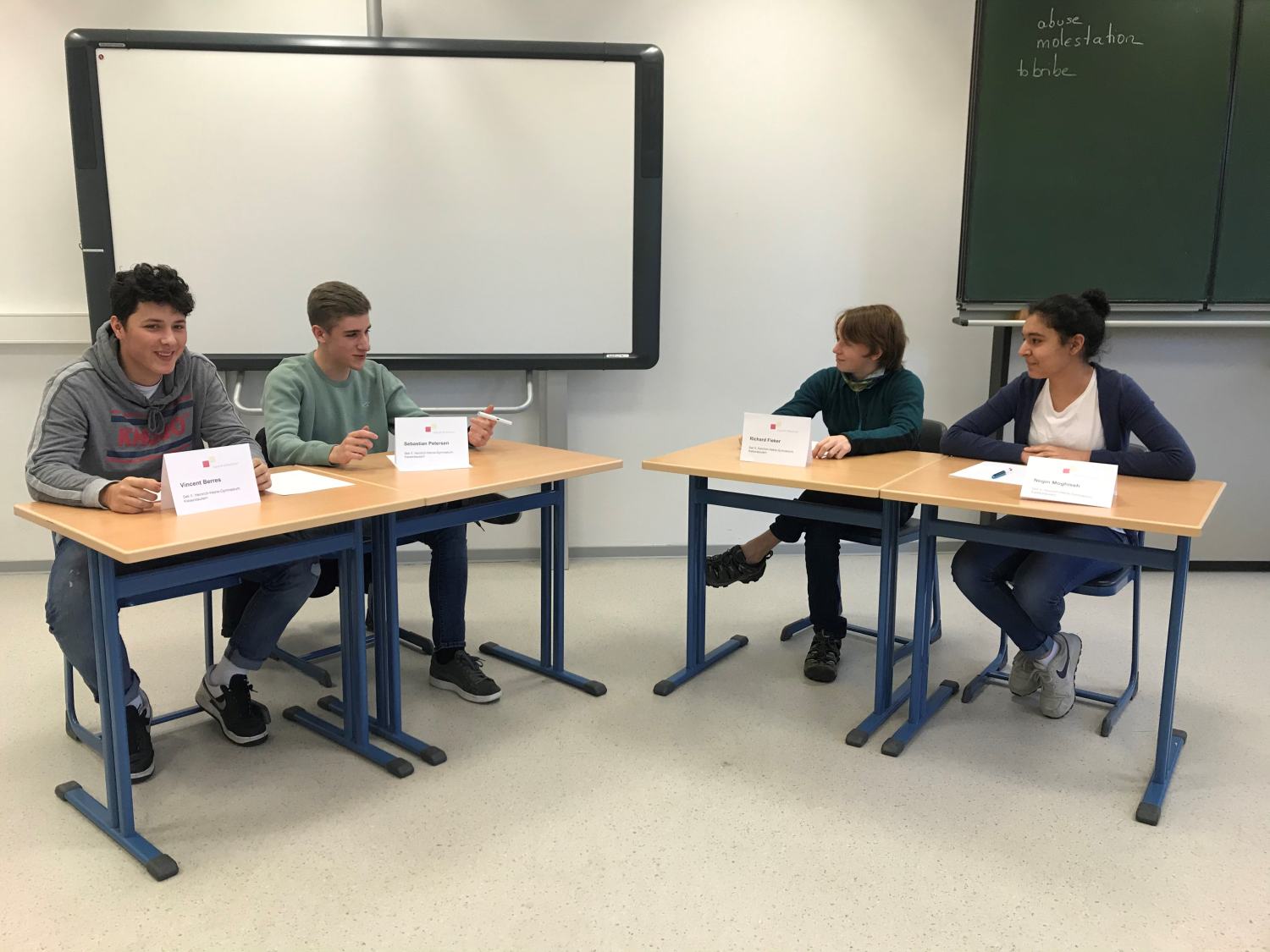 Auch in diesem Schuljahr wurde wieder fleißig debattiert. Die Kurssieger*innen der Oberstufenkurse traten zum Schulfinale an. Mit viel Beifall wurden Vincent Berres, Sebastian Petersen, Richard Fieker und Negin Moghiseh (alle MSS 11), die aus den Debatten ihrer Kurse als Sieger hervorgingen, beim Finale begrüßt.