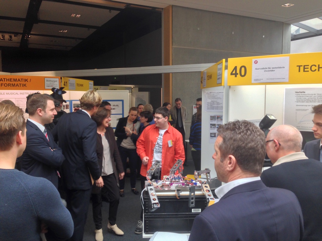 Valentin hat allerdings einen Sonderpreis (dotiert mit 250 €) und ein Praktikum beim Team proTRon der Hochschule Trier erhalten. Er konnte der rheinland-pfälzischen Ministerpräsidentin, Frau Malu Dreyer sein Projekt vor laufender Kamera des SWR-Teams vorstellen. Betreuer der Schule in Bitburg waren Frau Schuhmacher und Herr Petry (Kurzbericht und Fotos). Unsere stellvertretende Schulleiterin, Frau Dr. Dittberner, erlebte als Wettbewerbsleiterin "Schüler experimentieren" den Erfolg unserer Schüler hautnah vor Ort. Durch die Abschluss-Veranstaltung führte der bekannte TV-Moderator Günther Jauch.