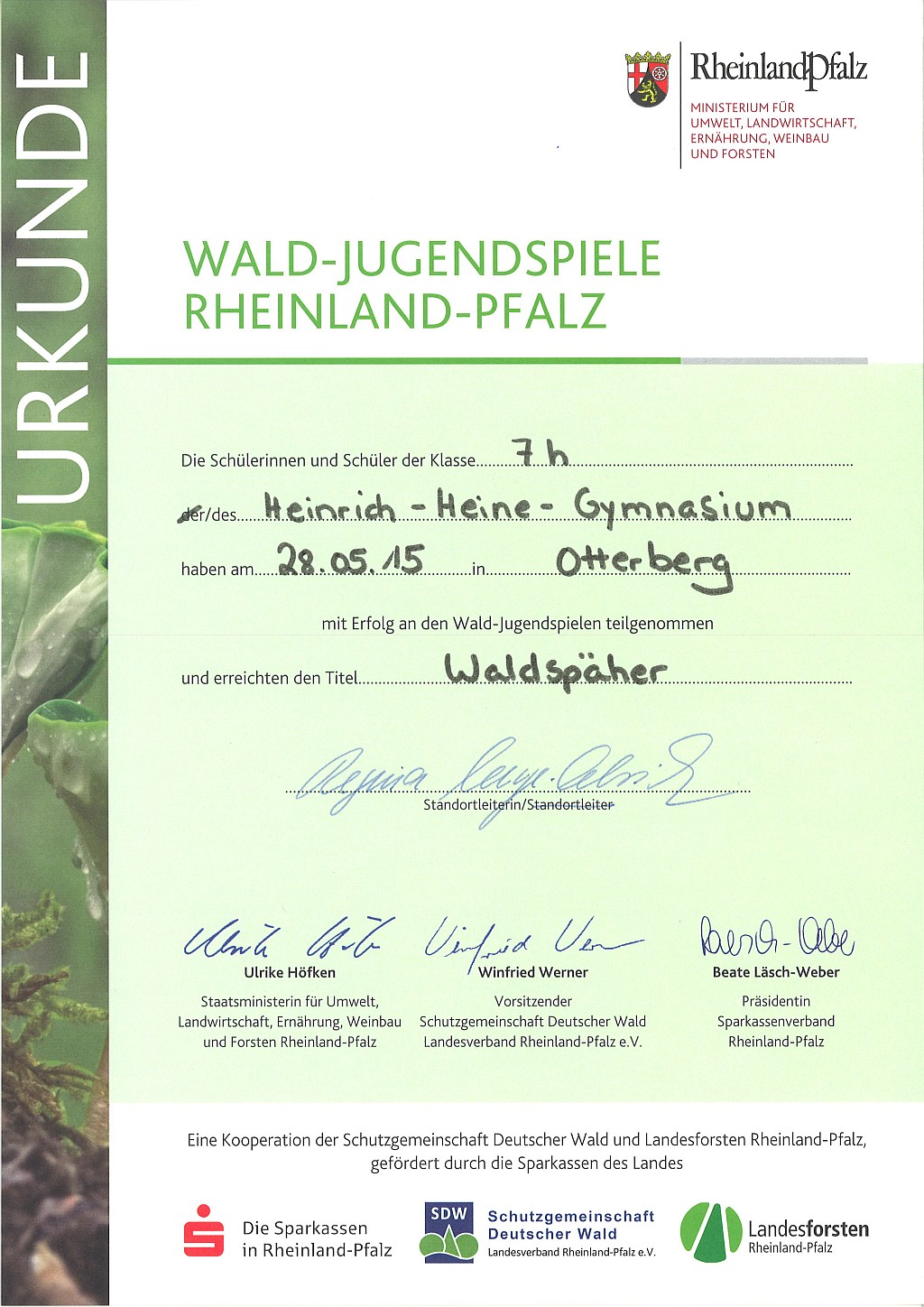 (Ma) Am 28.05.2015 war es wieder soweit: zahlreiche 7. Klassen aus dem Umkreis von Kaiserslautern maßen sich bei den Waldjugendspielen. Die 33. Ausgabe dieses Wettbewerbes wurde von der Schutzgemeinschaft Deutscher Wald Rheinland-Pfalz e.V. und den Landesforsten Rheinland-Pfalz in Zusammenarbeit mit dem Forst- sowie dem Bildungsministerium organisiert. Dazu reiste auch das HHG mit zwei Klassen (7h und 7s2) in die Nähe von Otterberg.
