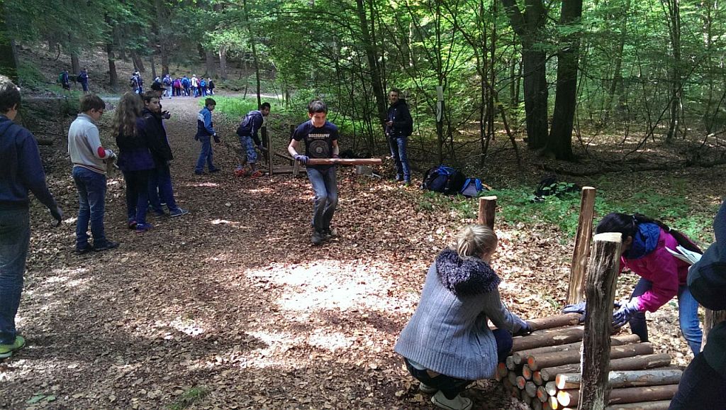 Bei angenehmem Wetter wurden die Schüler von ihren Forstpaten durch einen großräumig angelegten Parcours geführt und mussten verschiedenste Aufgaben bewältigen. Neben den Wissensgebieten „Wildtiere“, „Bäume“ und „Nachhaltigkeit“ mussten sie sich auch in sportlichen Spielen beweisen und z.B. einen imaginären Sumpf mit Holzscheiben überqueren. Im Hinblick auf die langfristige Bewahrung natürlicher Ressourcen wurde unter dem Themengebiet der Nachhaltigkeit von den Schülerinnen und Schülern ein Denken und Planen für die Zukunft gefordert. Im Spiel sollten die Schüler einen Wald über mehrere Generationen hinweg durch Ernten und Aufforsten nachhaltig bewirtschaften.