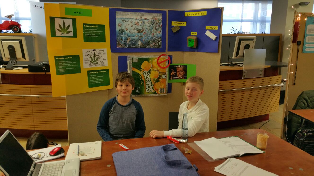 Jonathan Gärtner (5h) und Jan-Ole Köntopp (6h) entwickelten für den Bereich Arbeitswelt eine umweltfreundliche Kühltasche. Sie leisten mit ihrer Arbeit einen Betrag, die Plastikberge unserer Welt zu reduzieren. Ihre Kühltasche besteht nämlich aus Hanfmatten und einer Folie aus Maisstärke, um die Feuchtigkeit abzuhalten. Das Erstaunliche ist, dass ihre Konstruktion die Kälte länger beim Gefriergut hält, als herkömmliche Taschen aus dem Supermarkt. Neben diesem tollen Ergebnis überzeugten sie die Jury mit ihrem fundierten Fachwissen. Sie belohnte das mit dem 1. Platz und dem Umwelt-Sonderpreis.