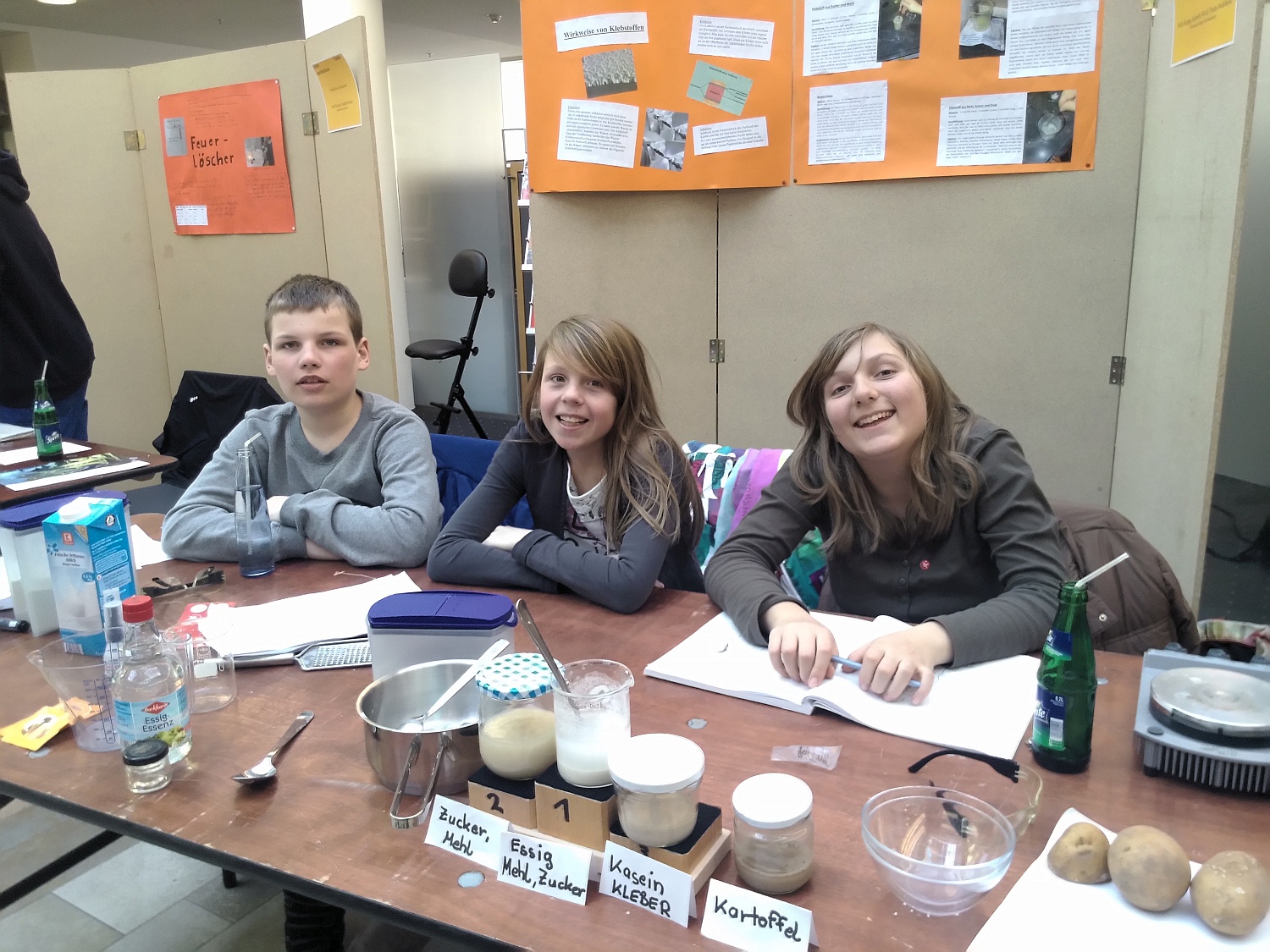 Felix Kopp, Paula Mohrhardt und Isabelle Wolf (6h) stellten Kleber aus Lebensmitteln her. Ausprobiert wurden die verschiedensten Kombinationen aus Stoffen wie Mehl, Zucker, Jogurt, Kartoffeln und vielem mehr. Getestet wurden neben der Haltekraft auch die Zeit, die der Kleber zum Festwerden benötigte. Eine Mischung aus Zucker, Mehl und Essig wurde ihr Testsieger. Sie starteten mit ihrer Arbeit auch im Bereich Chemie und erlangten hier den 3. Platz. Zusätzlich wurden sie mit dem Sonderpreis "Nachwachsende Rohstoffe" ausgezeichnet.